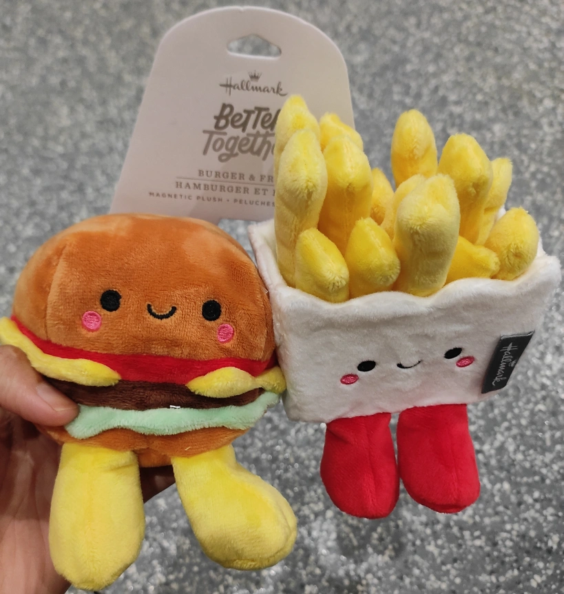 These adorable Hallmark 'Better Together' plushies are burger and fries! They connect with magnets, making them a super cute pair. Perfect for kids or anyone who loves a fun, quirky plushie pal