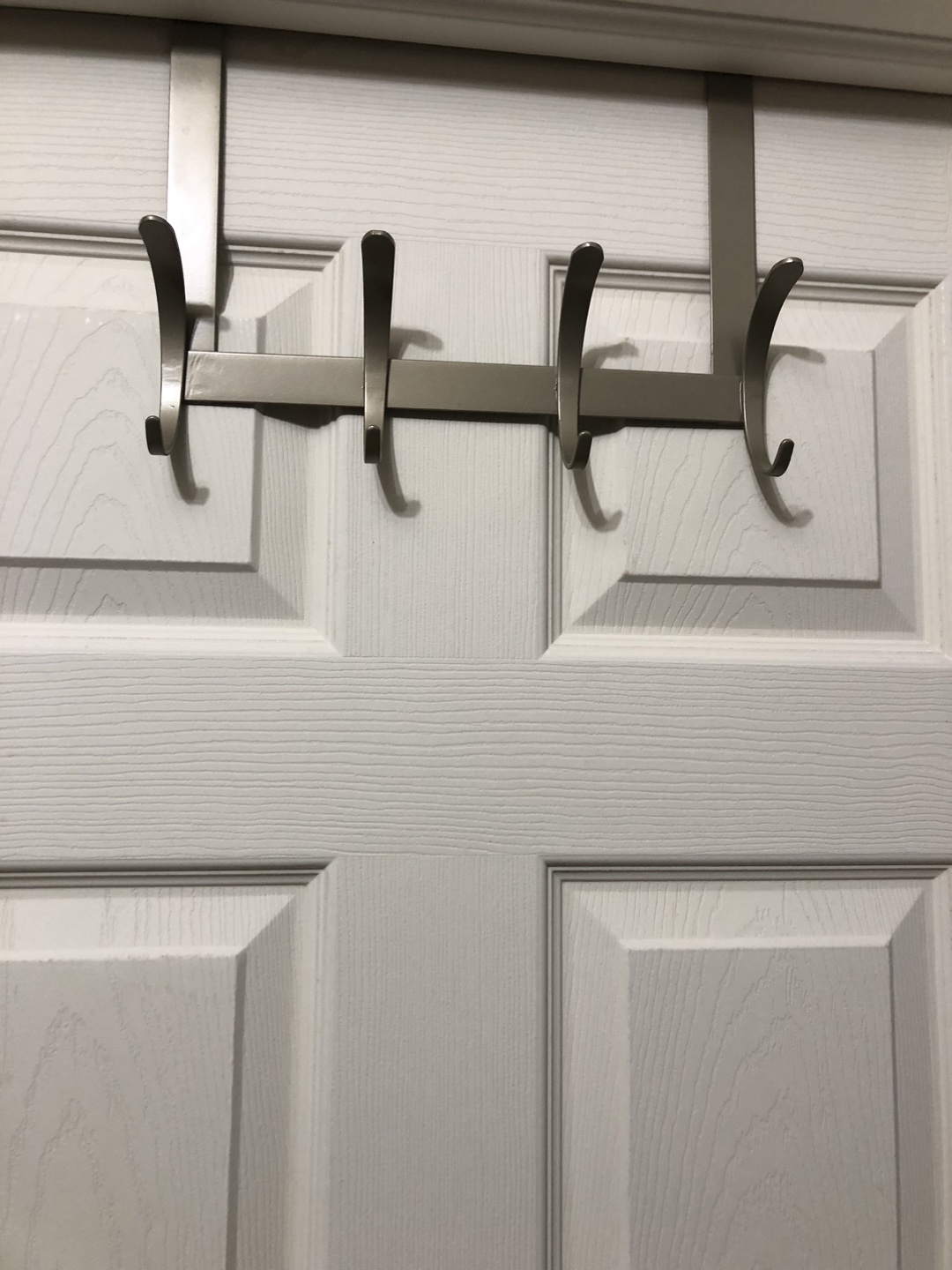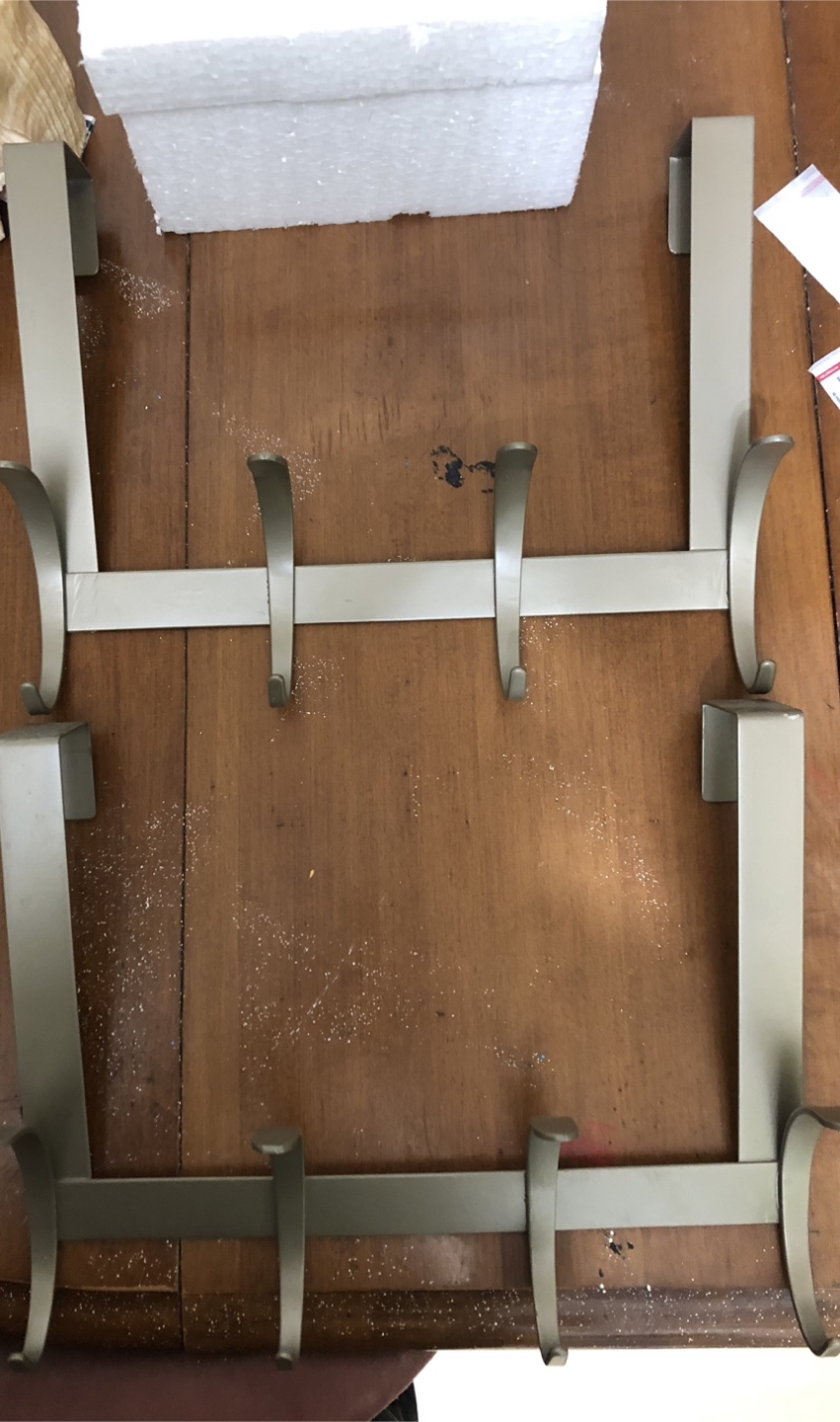 Here's a handy over-the-door hook rack that's perfect for adding extra storage to any room! It's in great shape and ready to use right away. Easy to install, just hang it over the door!