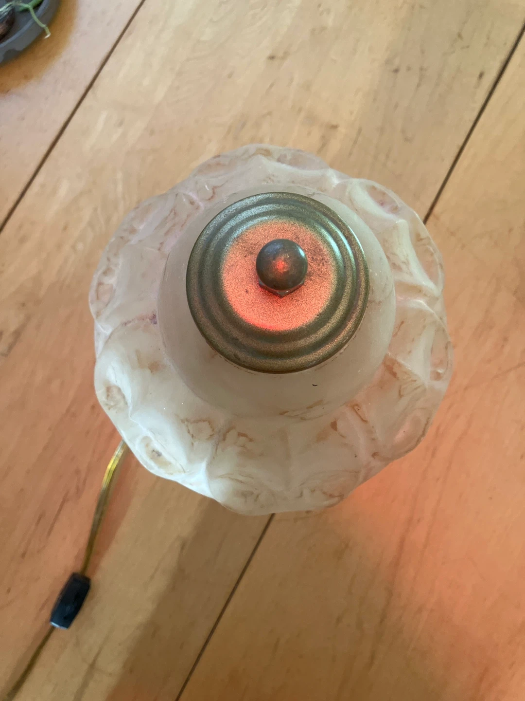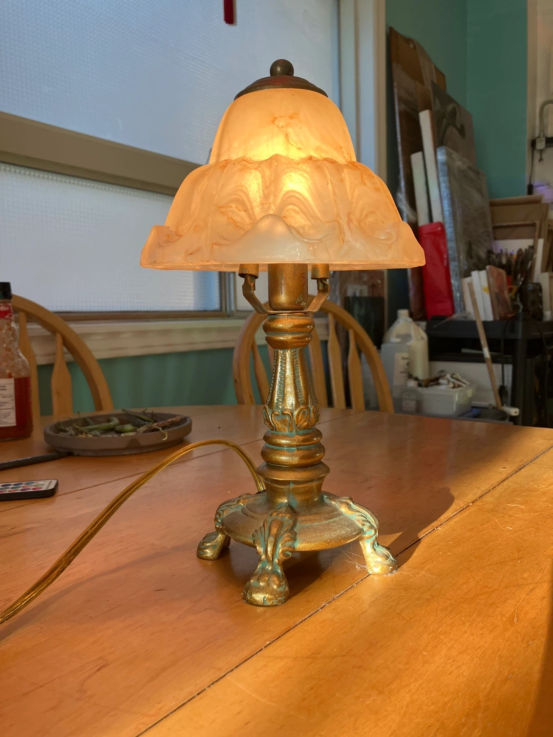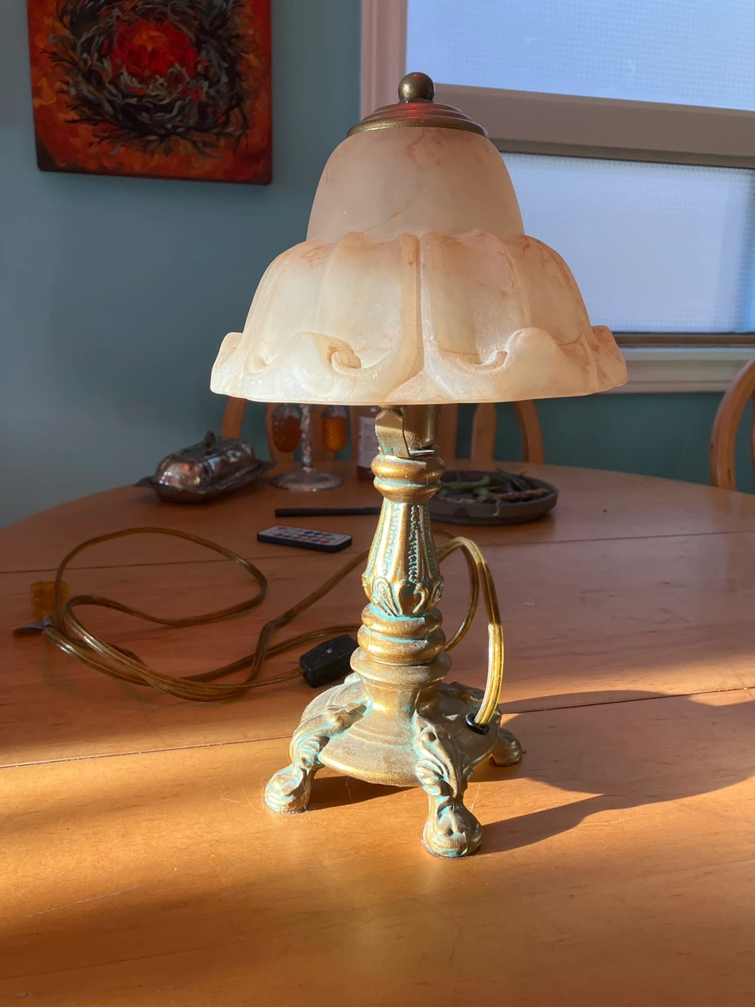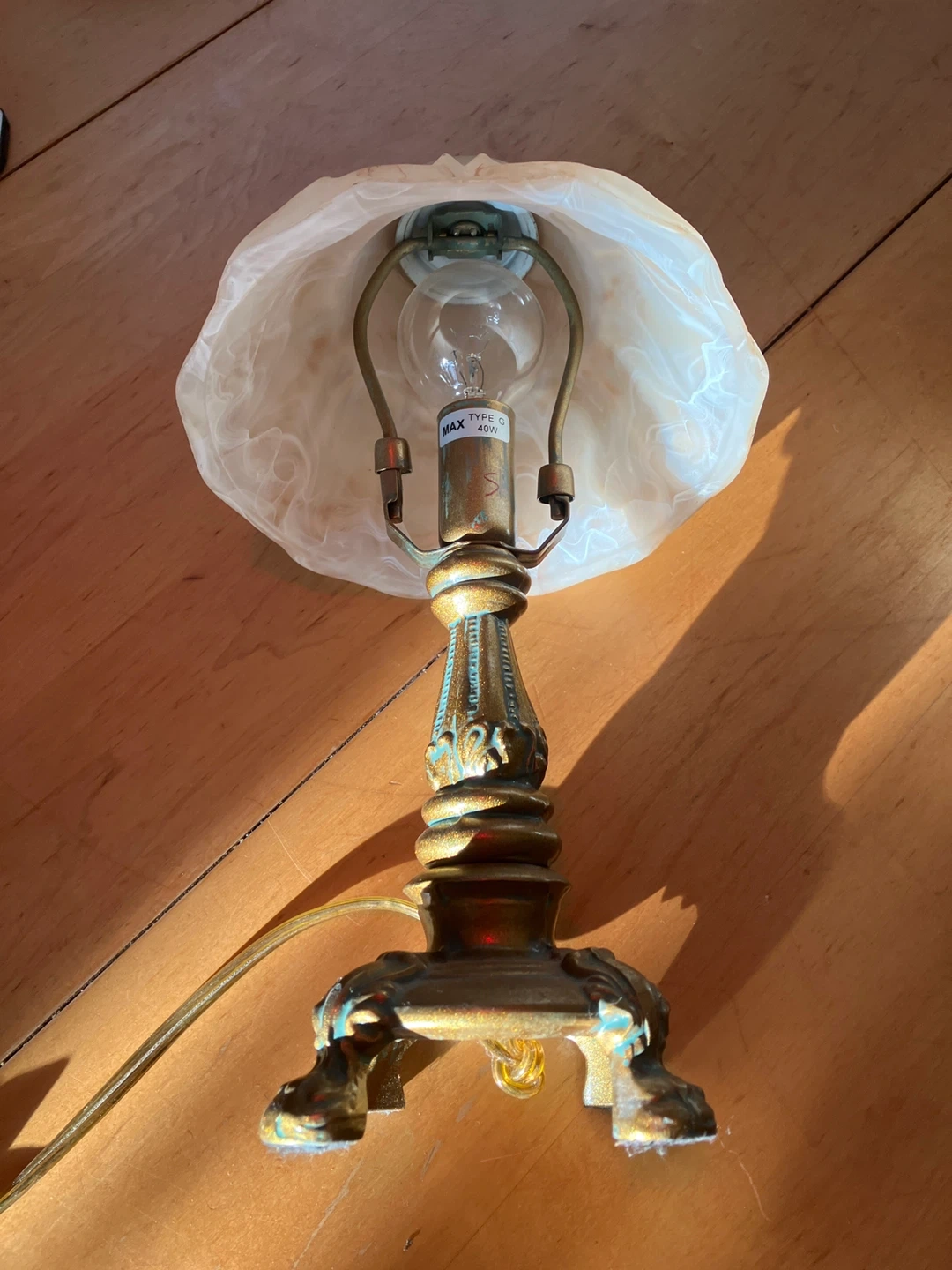 Cream marbled with taupe thick frosted glass. Old fashioned light bulb. Solid gold coloured metal. Some blue patina