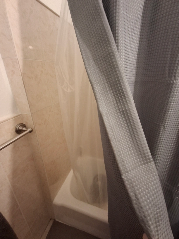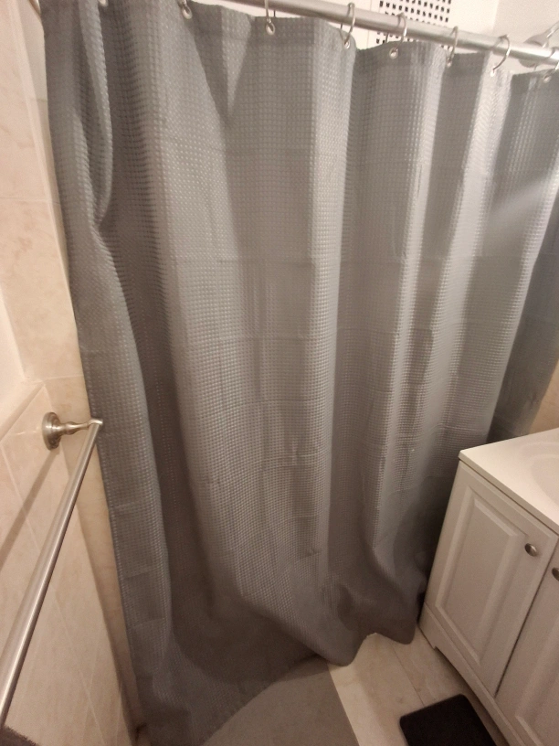 Selling a set including one gray waffle weave shower curtain in washable fabric with its PVC twin, 12 sturdy metallic hooks. Easy to install, it's in great condition and ready to add a touch of texture to your bathroom!