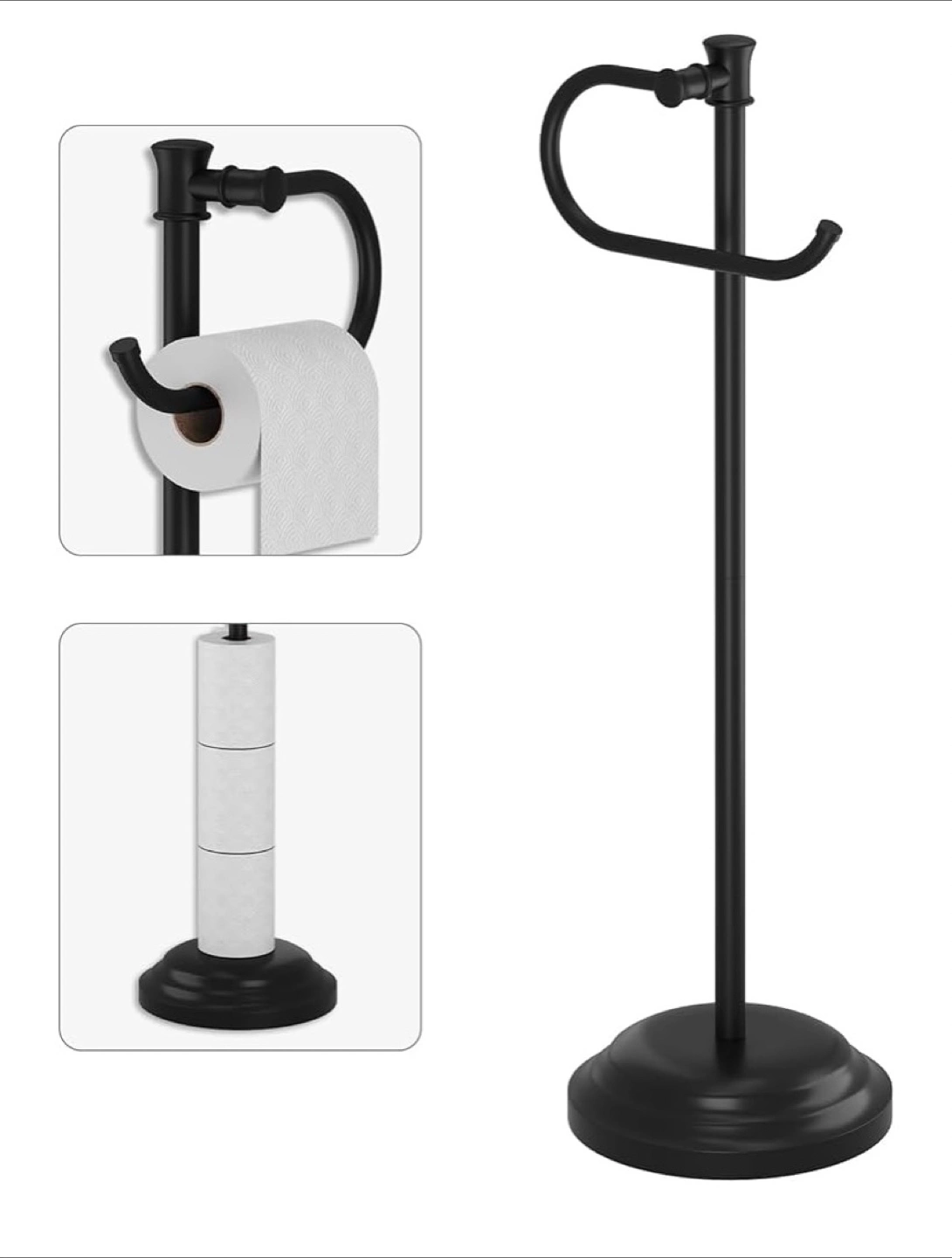 Here's a sleek black toilet paper holder stand. It's a great addition to any bathroom, providing a convenient and stylish way to store toilet paper rolls. The stand is sturdy and designed to hold multiple rolls, keeping them within easy reach.