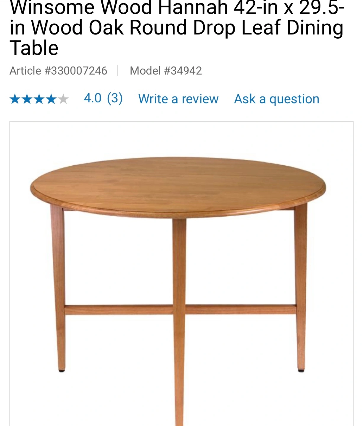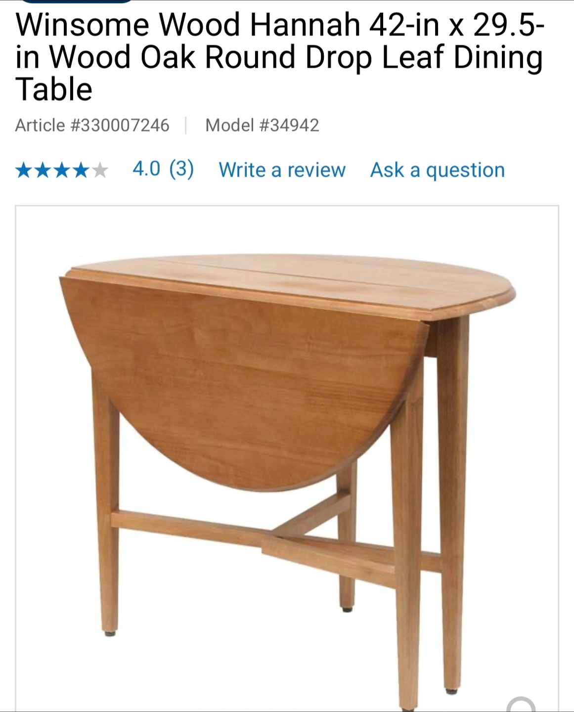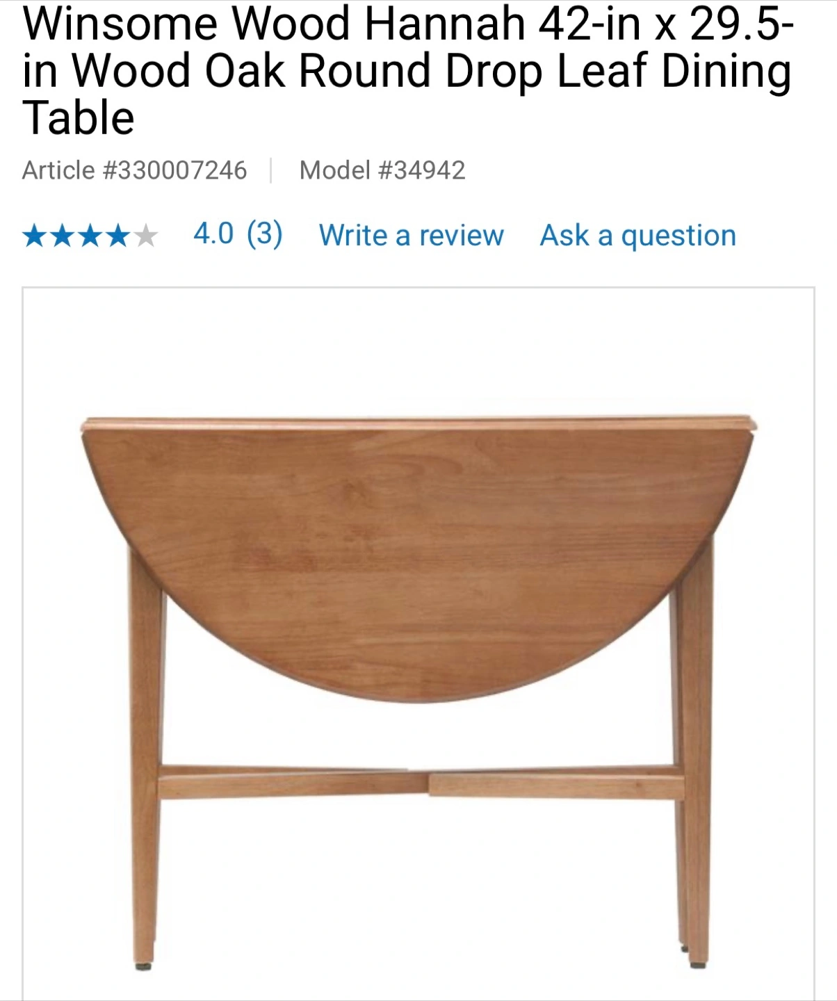 Selling a Winsome Wood Hannah 42-inch x 29.5-inch Wood Oak Round Drop Leaf Dining Table. It's in great shape and ready for a new home! The model number is #34942.