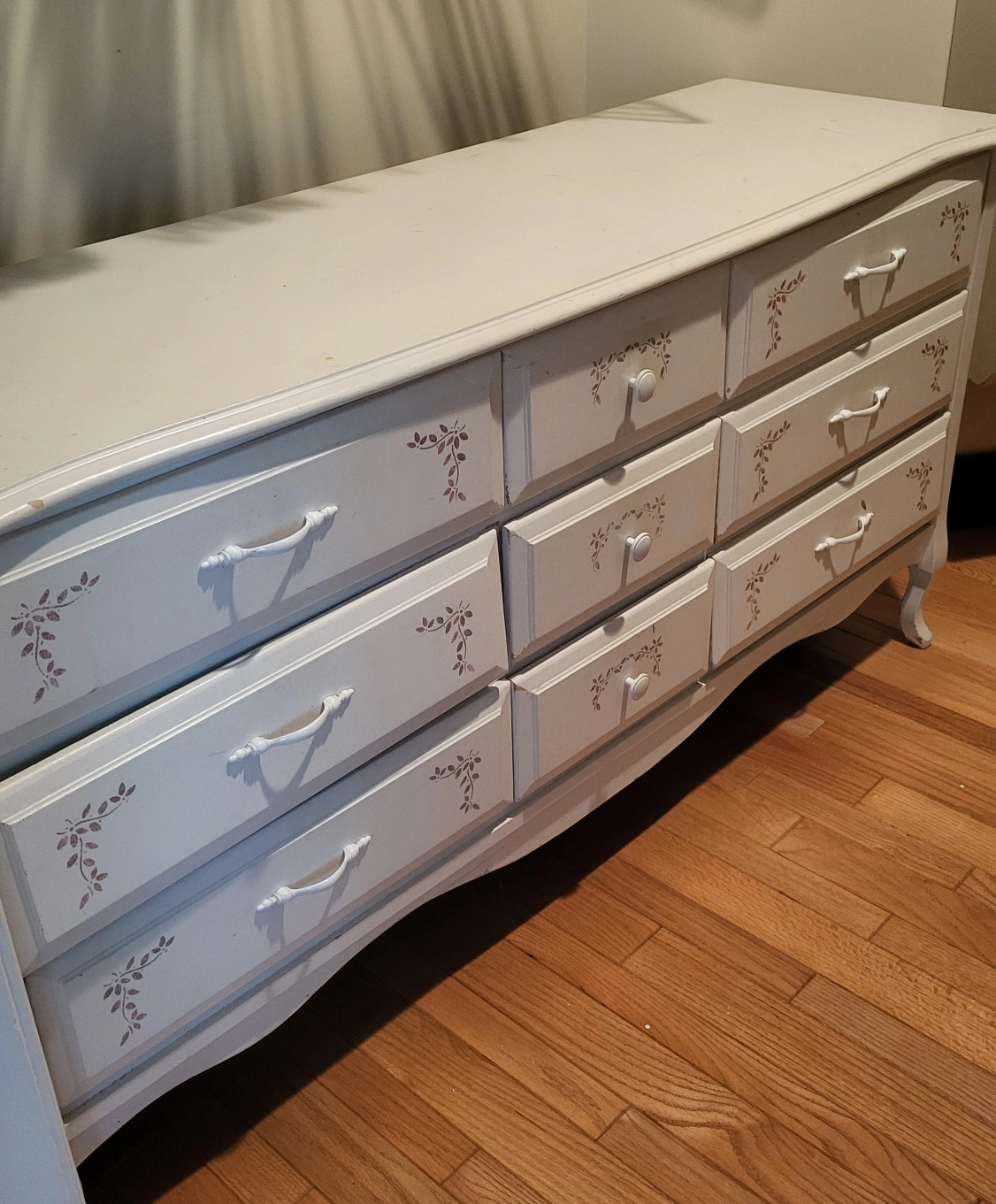 Here's a lovely white dresser with nine drawers! It has a charming floral design on the corners of each drawer. Perfect for adding a touch of vintage style to your bedroom or guest room
