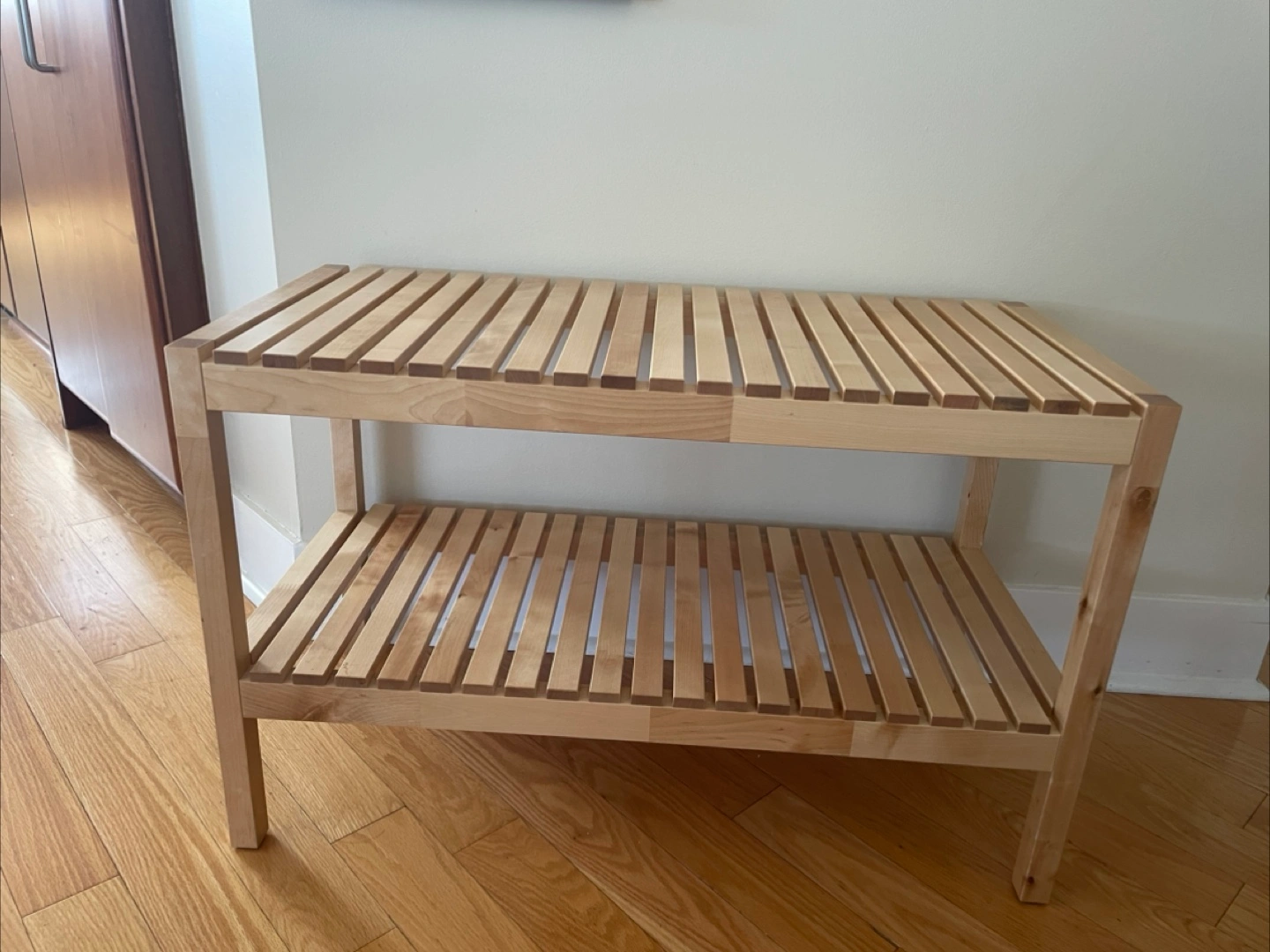 Looking to sell my IKEA Molger bench in birch. It's in great shape and perfect for an entryway or bathroom. Provides extra storage with its two shelves!