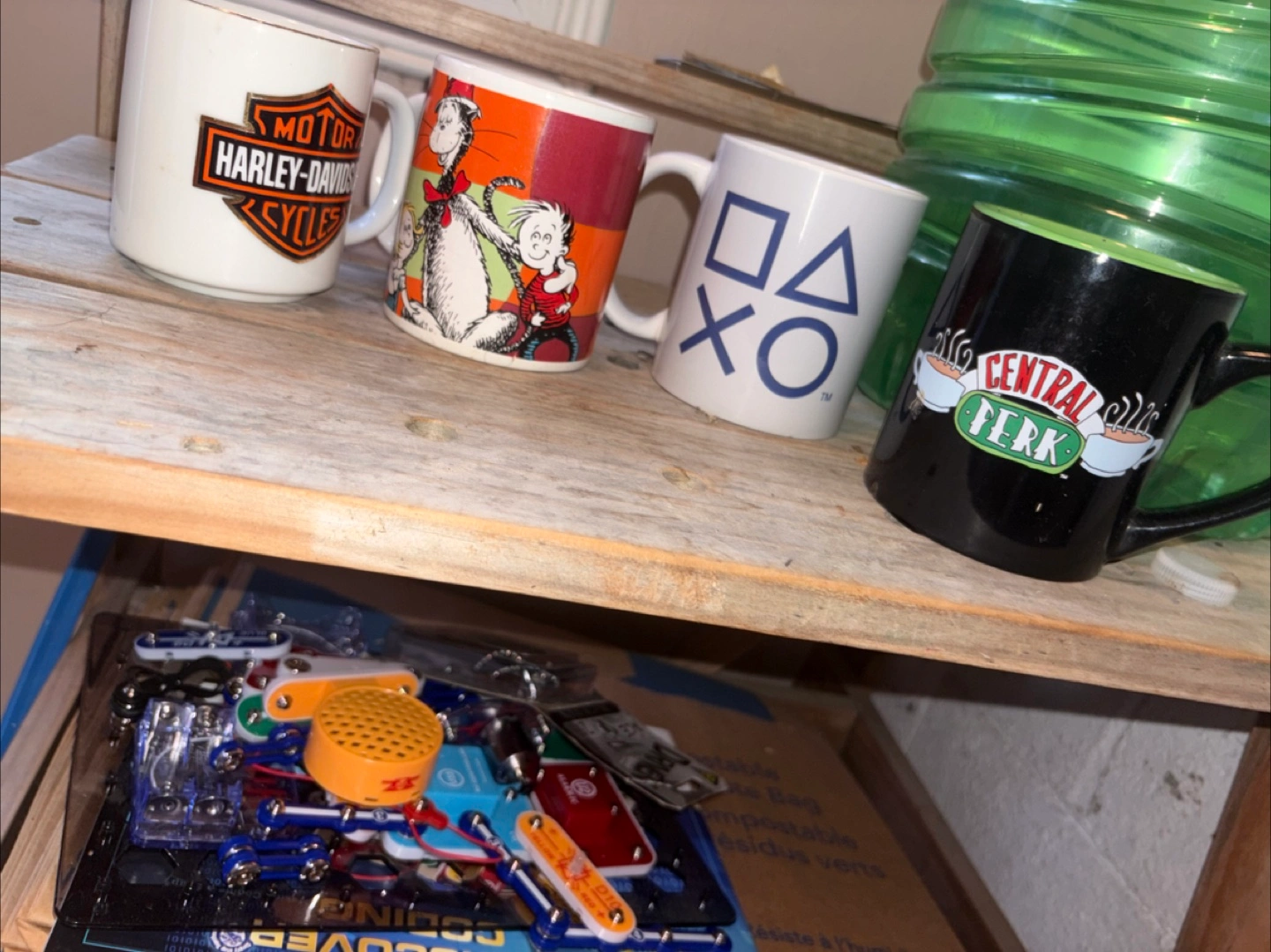 Selling a collection of mugs! There's a Harley Davidson mug, a Dr. Seuss mug, a Playstation mug, and a Central Perk mug from Friends