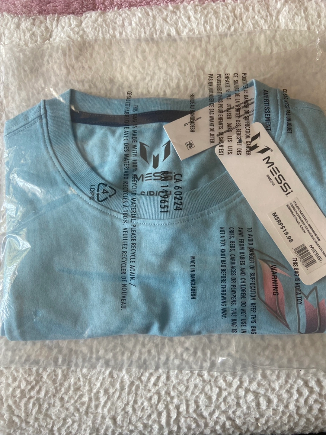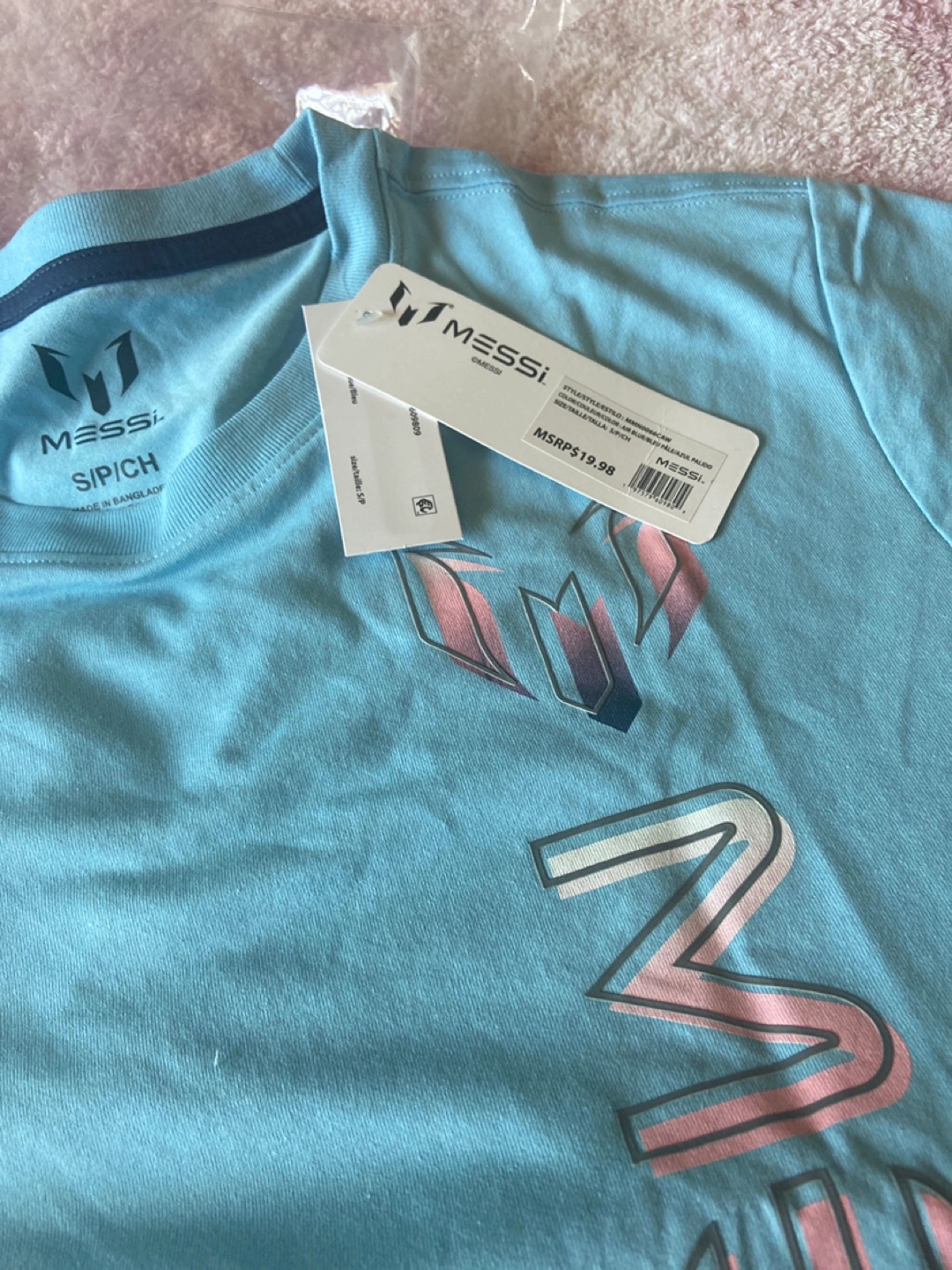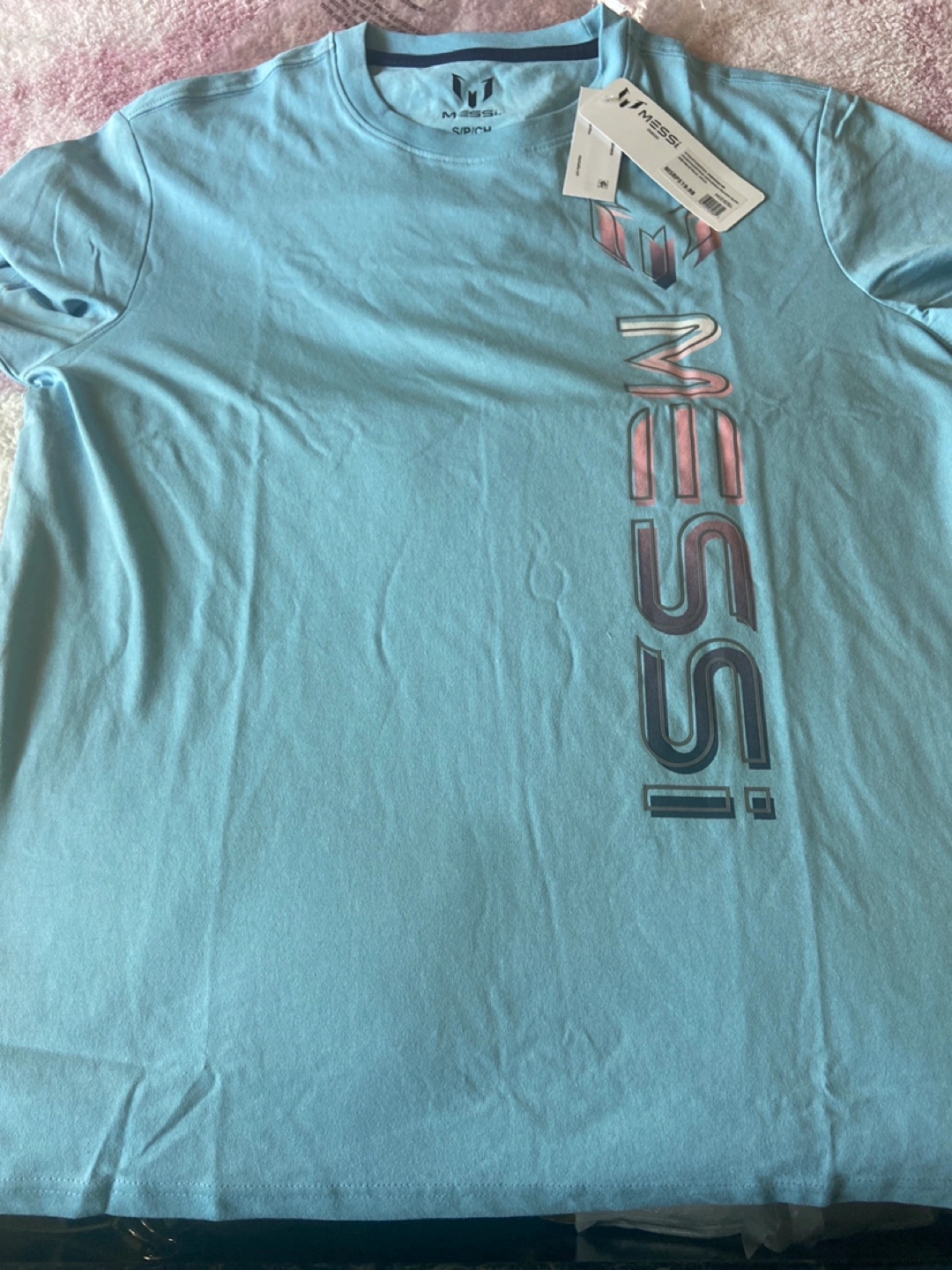 I'm selling a brand new Messi brand t-shirt! It's a light blue colour and size small. The tag shows an original price of $19.98.