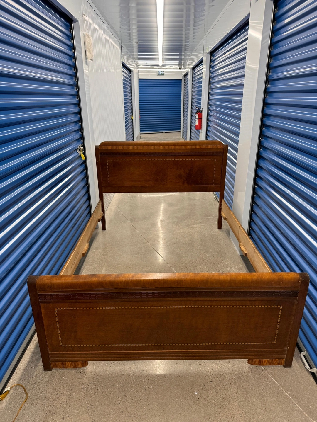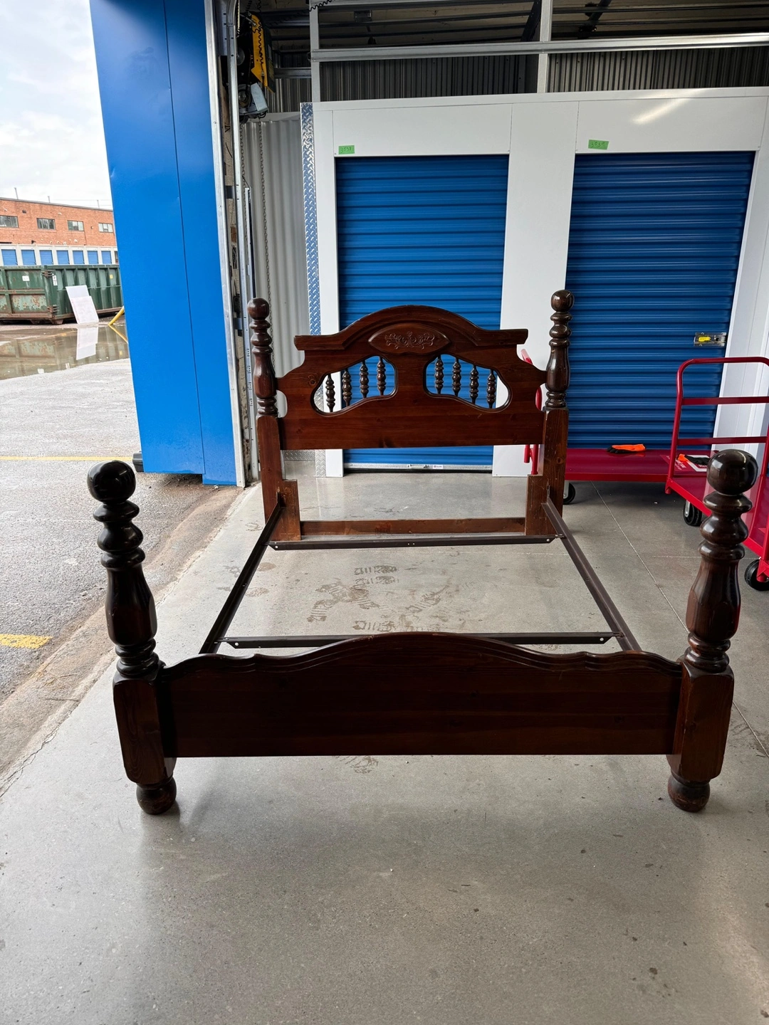 Selling a beautiful wooden bedroom set! This set includes a bed frame, a dresser with a mirror, and two nightstands. The wood has a rich, dark finish and intricate carvings on the drawer fronts and headboard. It's a complete set to furnish your bedroom with a classic and elegant style