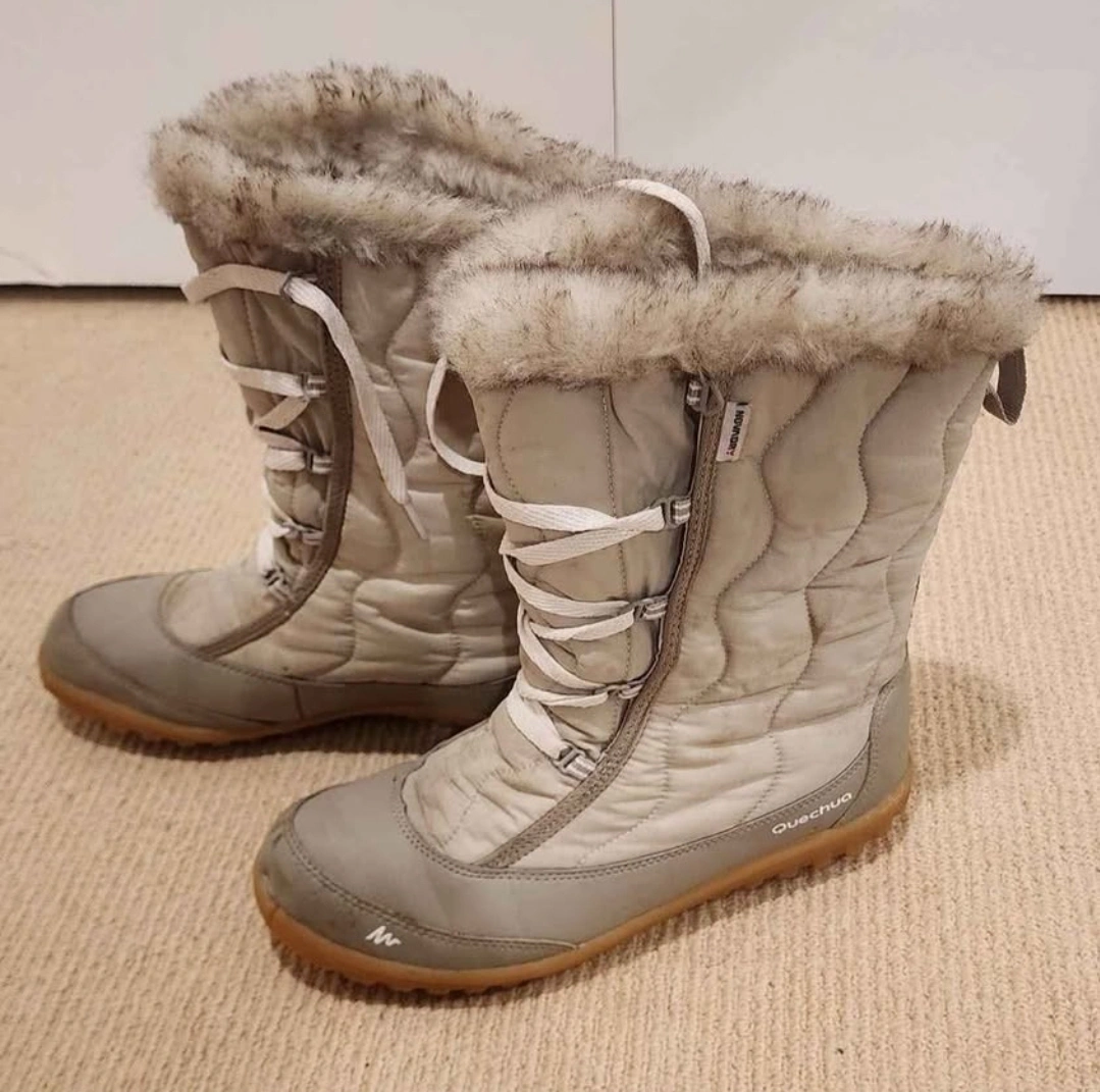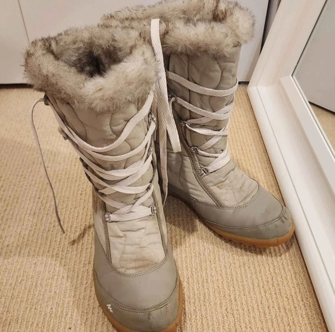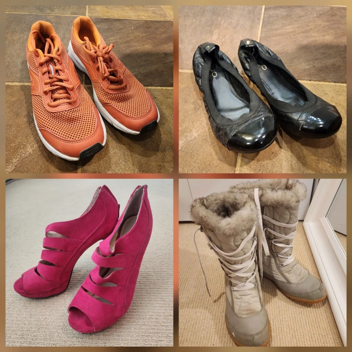 Selling a collection of women's shoes! There's a pair of black Aldo flats, some orange running shoes, pink heels, and some grey winter boots. All are in used condition. Please see photos for details