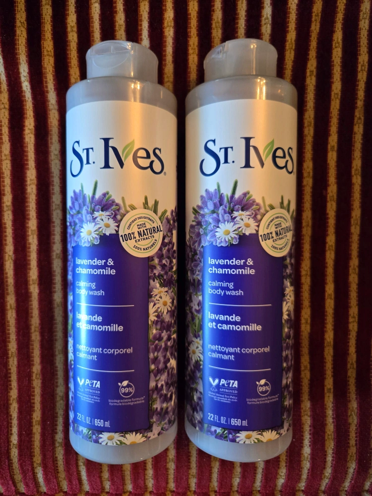 St.Ives body wash! Dark Cherry & Argan Oil, Oatmeal & Shea Butter, and Lavender & Chamomile. Each bottle is 22 fl oz (650 mL).
