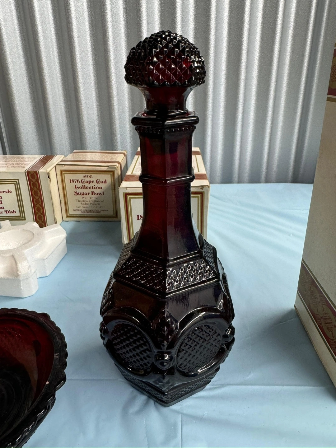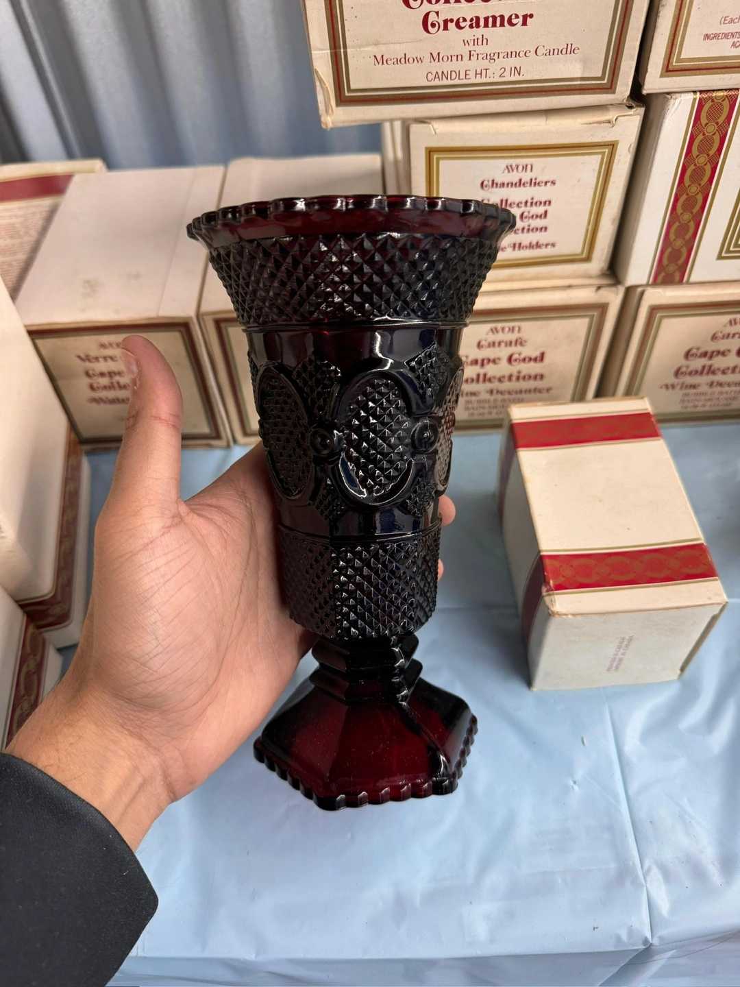 Avon's 1875 Cape Cod pattern glass dinnerware, made from 1975 to 1993, is one of the most beautiful deep ruby patterns . Selling a collection of Avon Cape Cod glassware in a beautiful ruby colour! There are various pieces available, including: - Wine decanters - Dessert plates - Candle holders - Goblets - Vases Each piece comes with its original box Price can be negotiate . Please DM for more details . Contact details below :- Gmail : kapoorneeraj1970@gmail.com. (437) 992-2700 (416) 857-2700