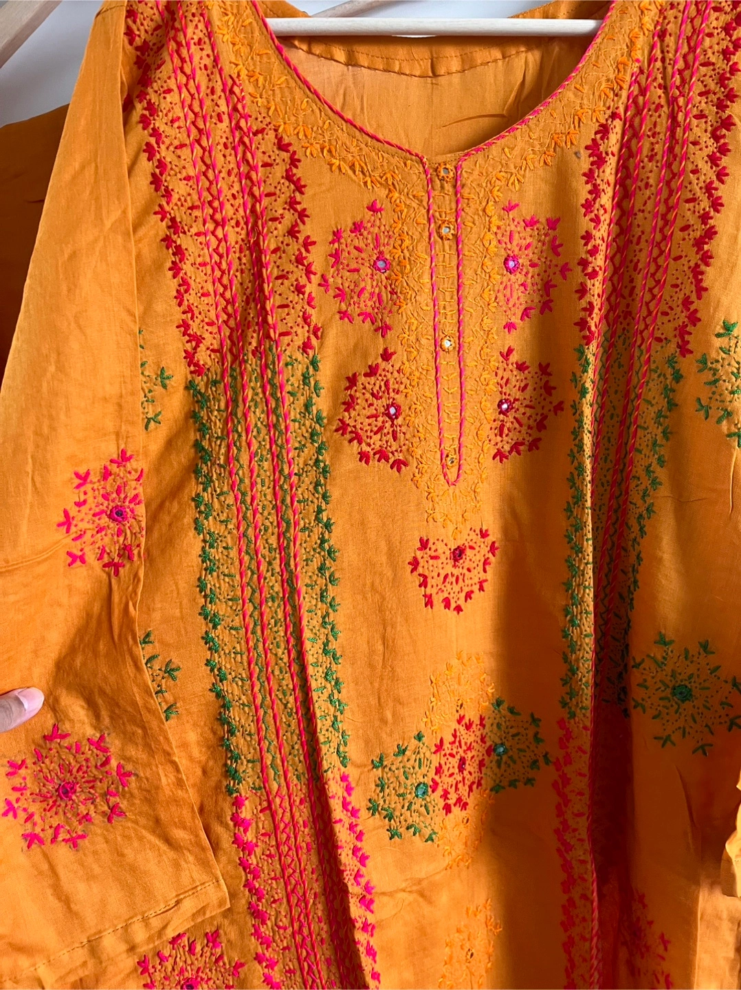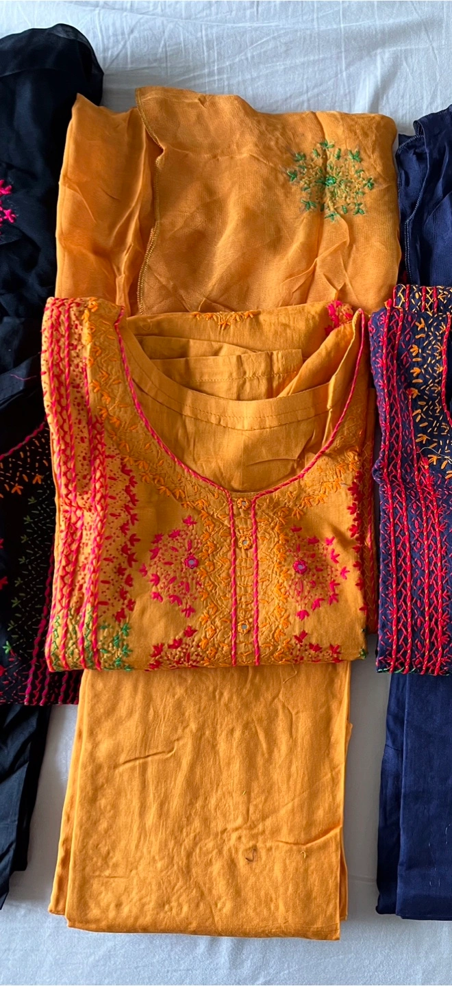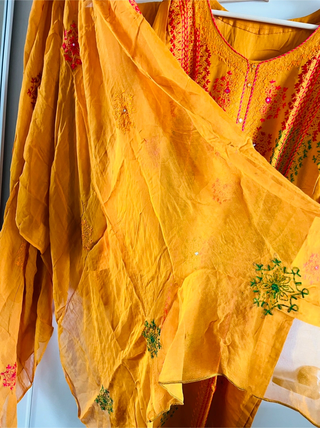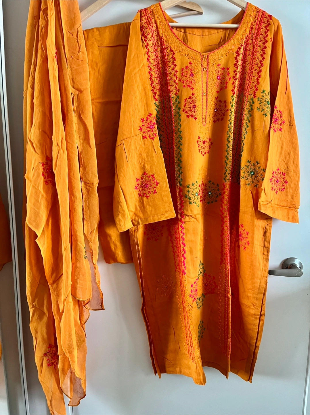 3pc suit new $30 firm Size xlarge Color mustard Includes embroidered lawn kameez, lawn trouser, and chiffon embroidered dupatta Pickup is Erinmills and Eglinton, Mississauga. Smoke and pet free