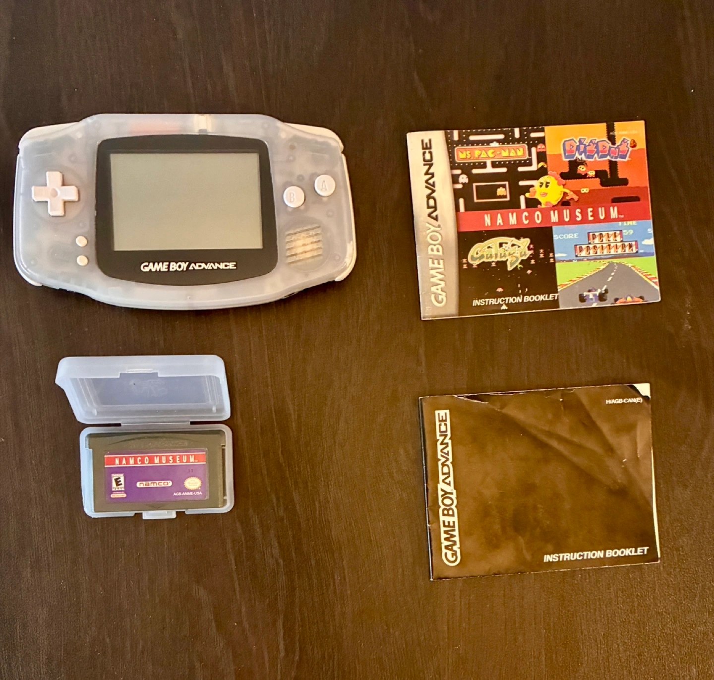 I'm selling a used Game Boy Advance bundle, perfect for retro gaming enthusiasts! This bundle includes the clear Game Boy Advance console (no battery cover), along with the Namco Museum game and its original instruction booklets. It's all ready for you to dive into some classic gaming fun. This used set is in good condition, ready for hours of entertainment.