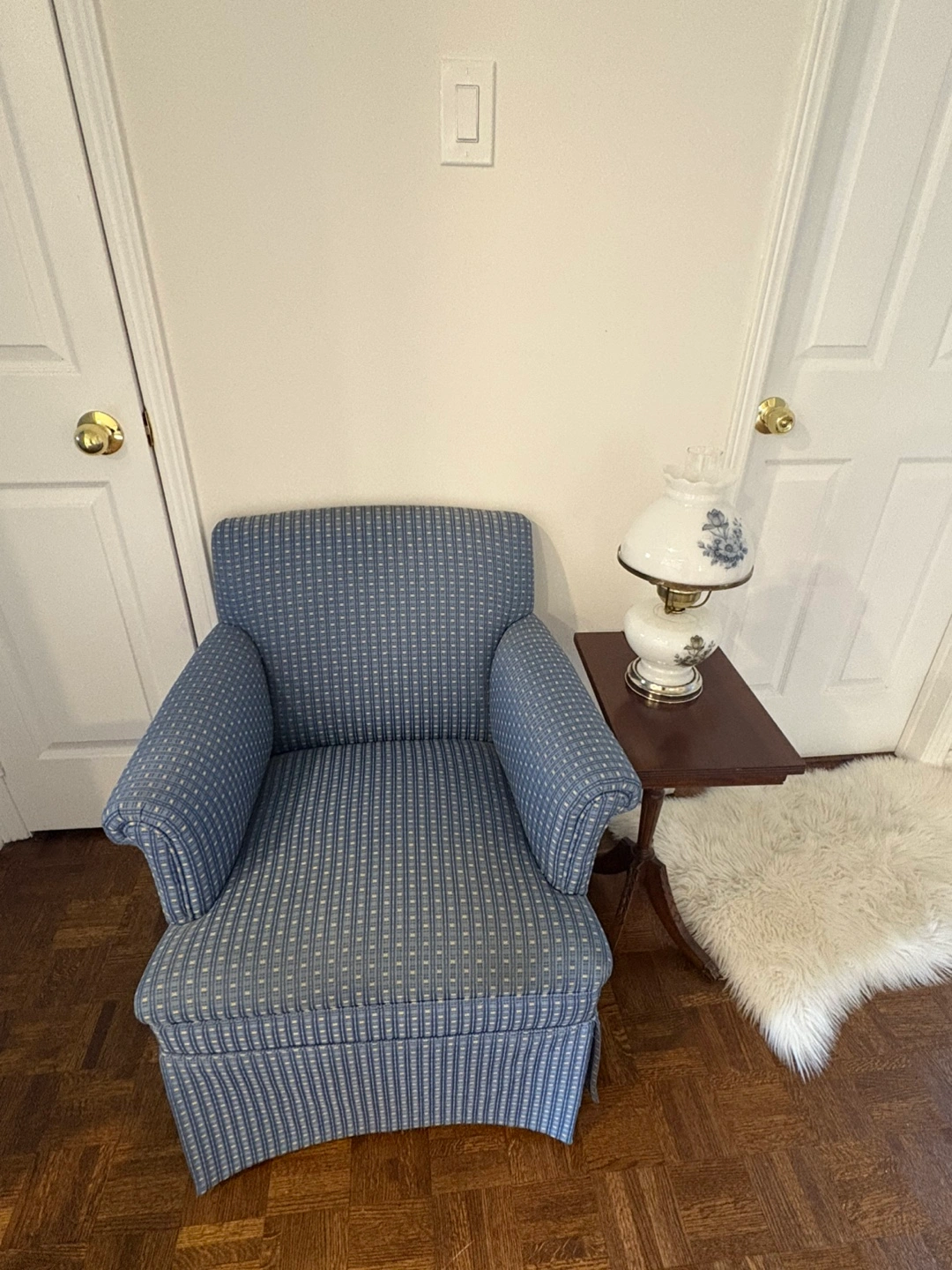 97Selling a comfy armchair with a blue patterned design! It's in great shape and would look lovely in any living room or reading nook. It has a classic style and is ready for a new home