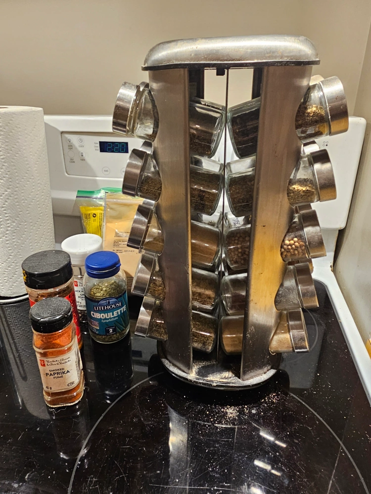 Selling a used spice rack that comes with 20 different spices. The rack is in good condition and ready to organize your kitchen! The spices are labelled in both English and French.