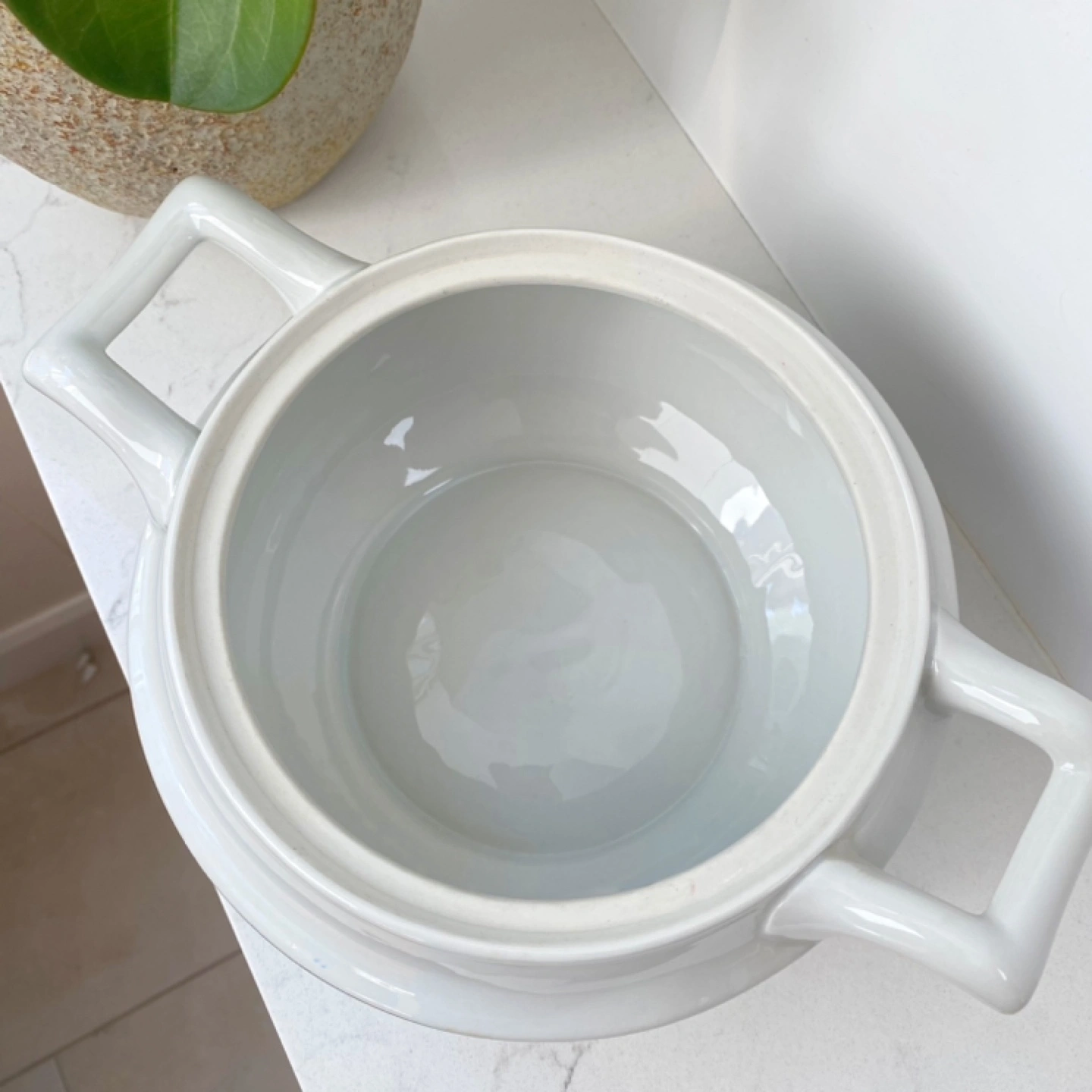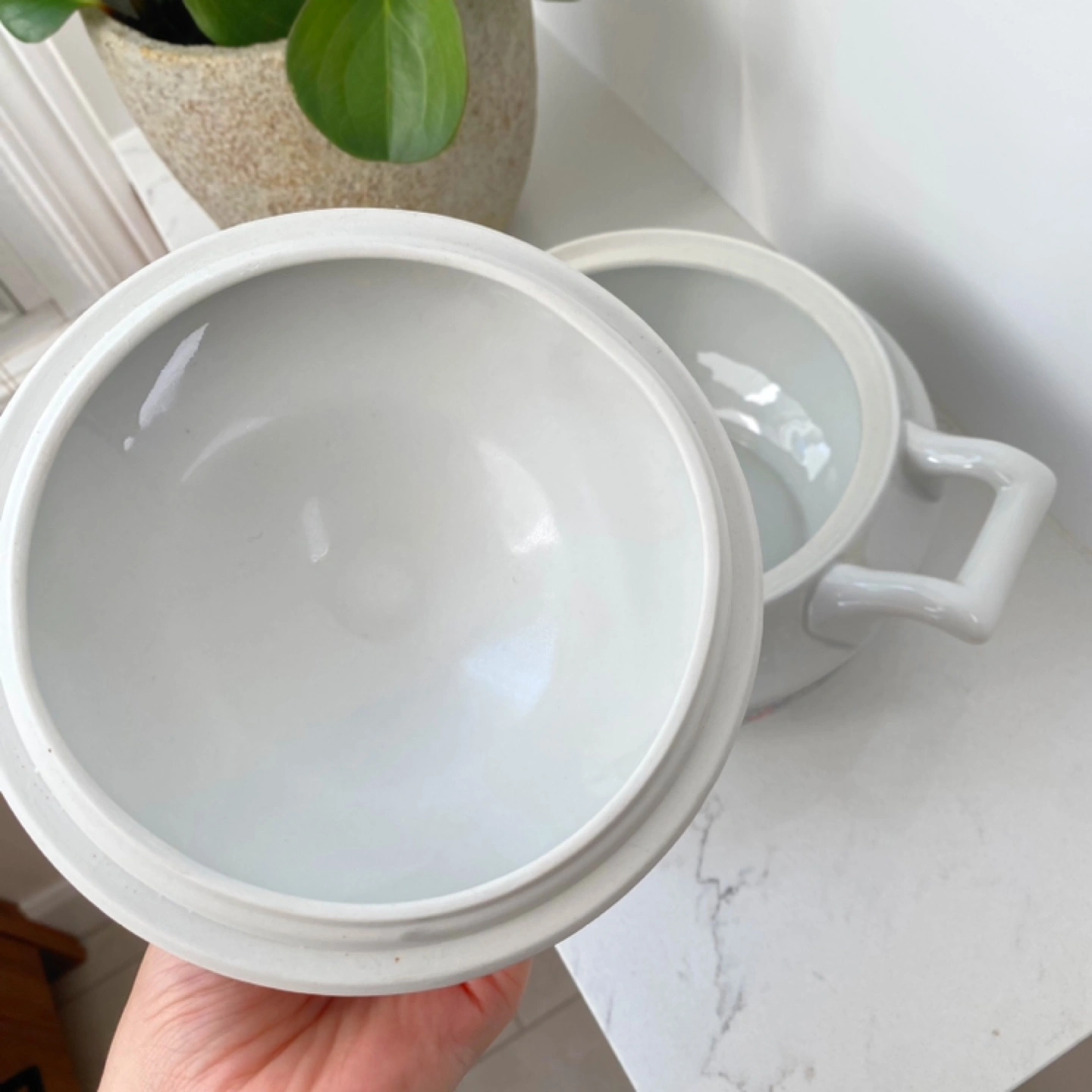 It includes a teapot, creamer, oval dish, and soup bowl. There is a small hairline crack on the lid of the tea pot (see photo). Otherwise, the set is in good condition and ready for a new home!