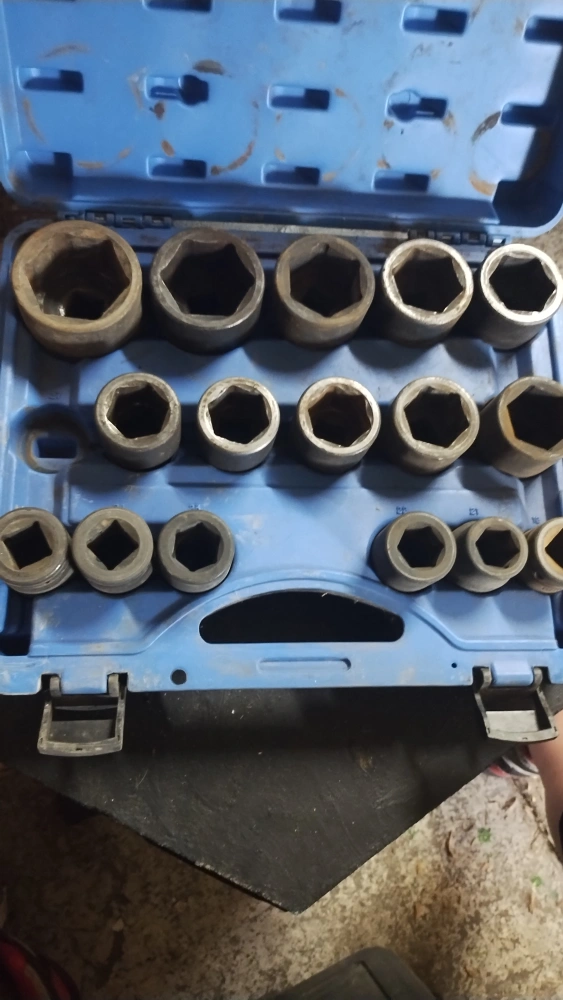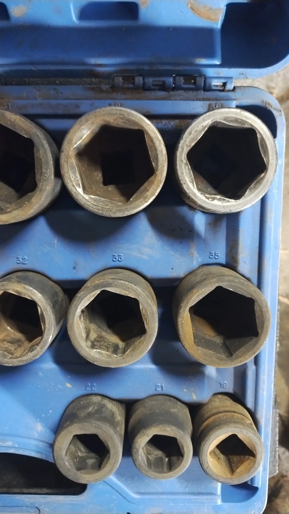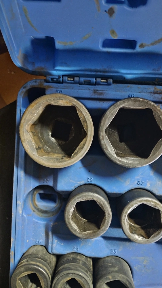 Socket set with a variety of sizes. Comes in a blue case for easy storage and organization. Some sockets have size markings like 32, 55, 50, 46, 28, 30, 27, 26, 24, and 23. ***missing one***