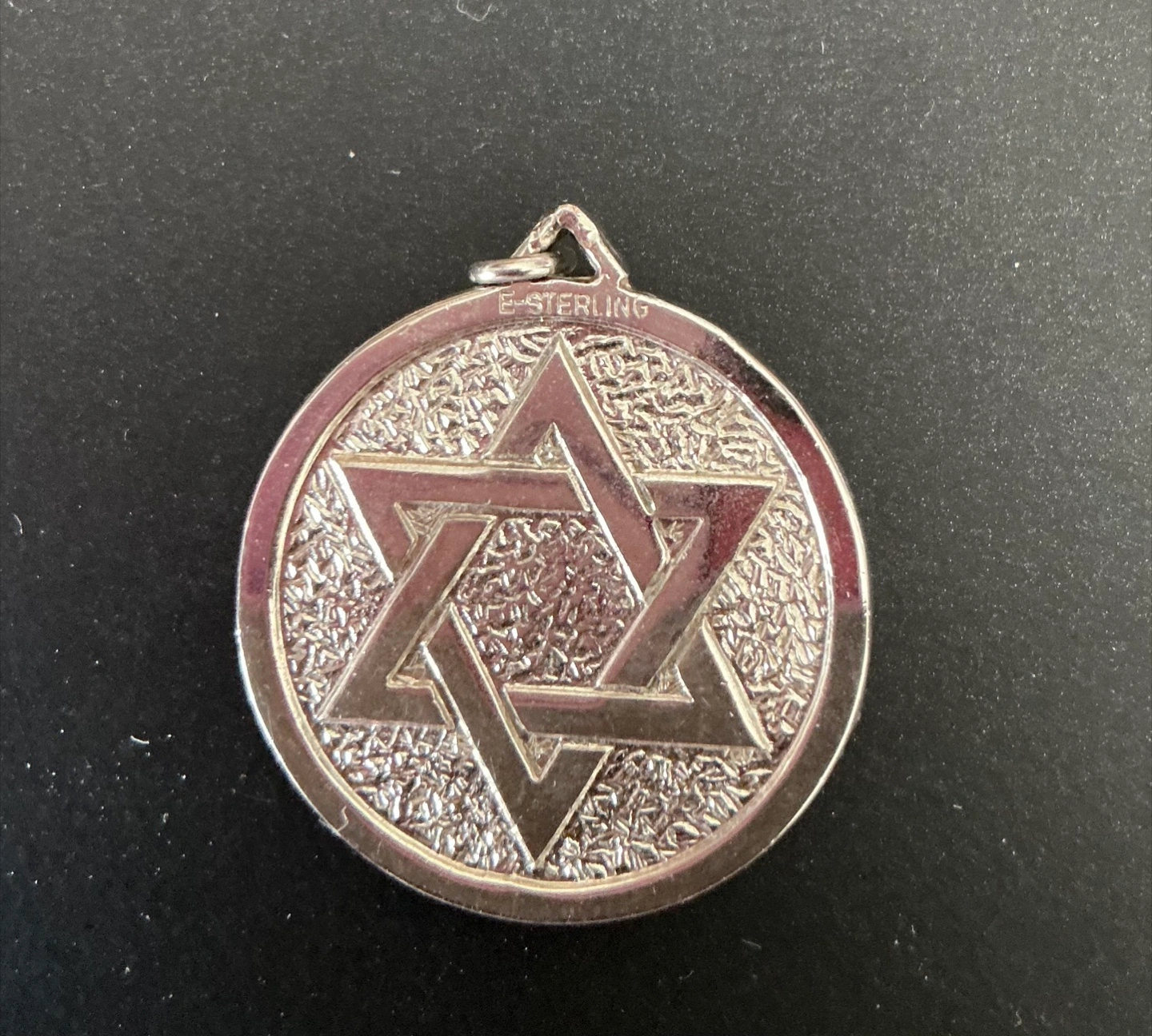 This is a vintage sterling silver pendant featuring the Star of David on one side and a depiction of Moses holding the Ten Commandments on the other. The pendant is marked 'E-STERLING'. It's in good condition and ready to wear or add to your collection