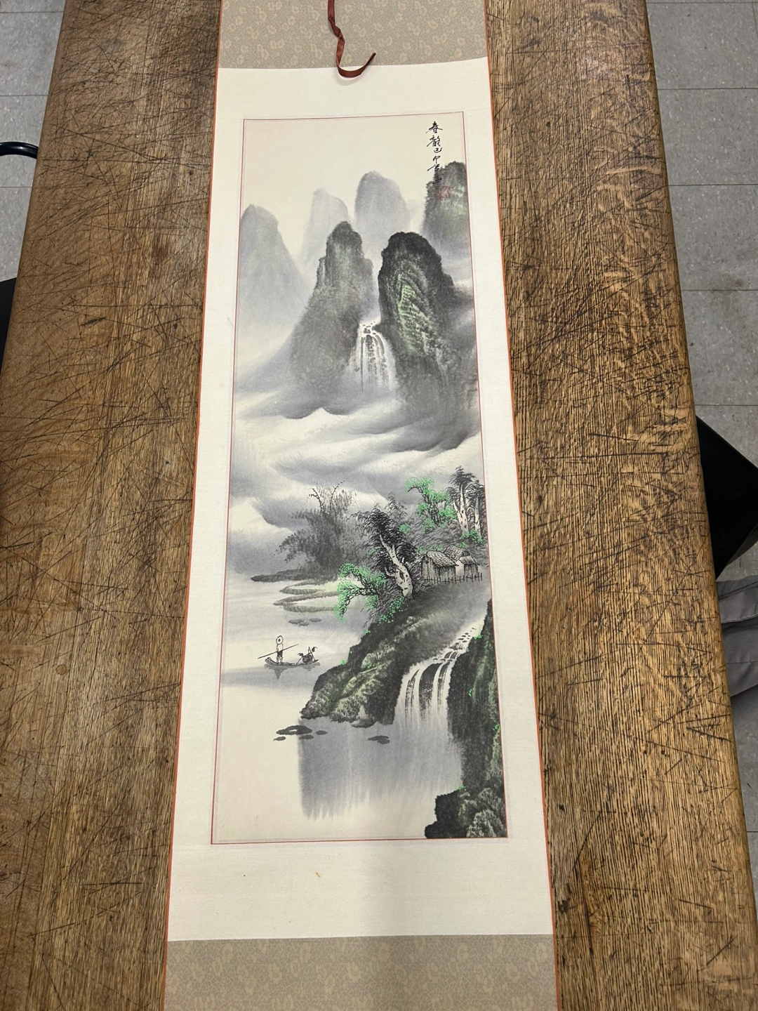 Beautiful Asian landscape painting scroll. It depicts a serene mountain scene with waterfalls and a small boat on the water. Perfect for adding a touch of tranquility to your home