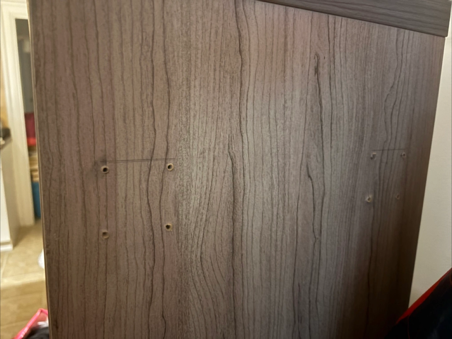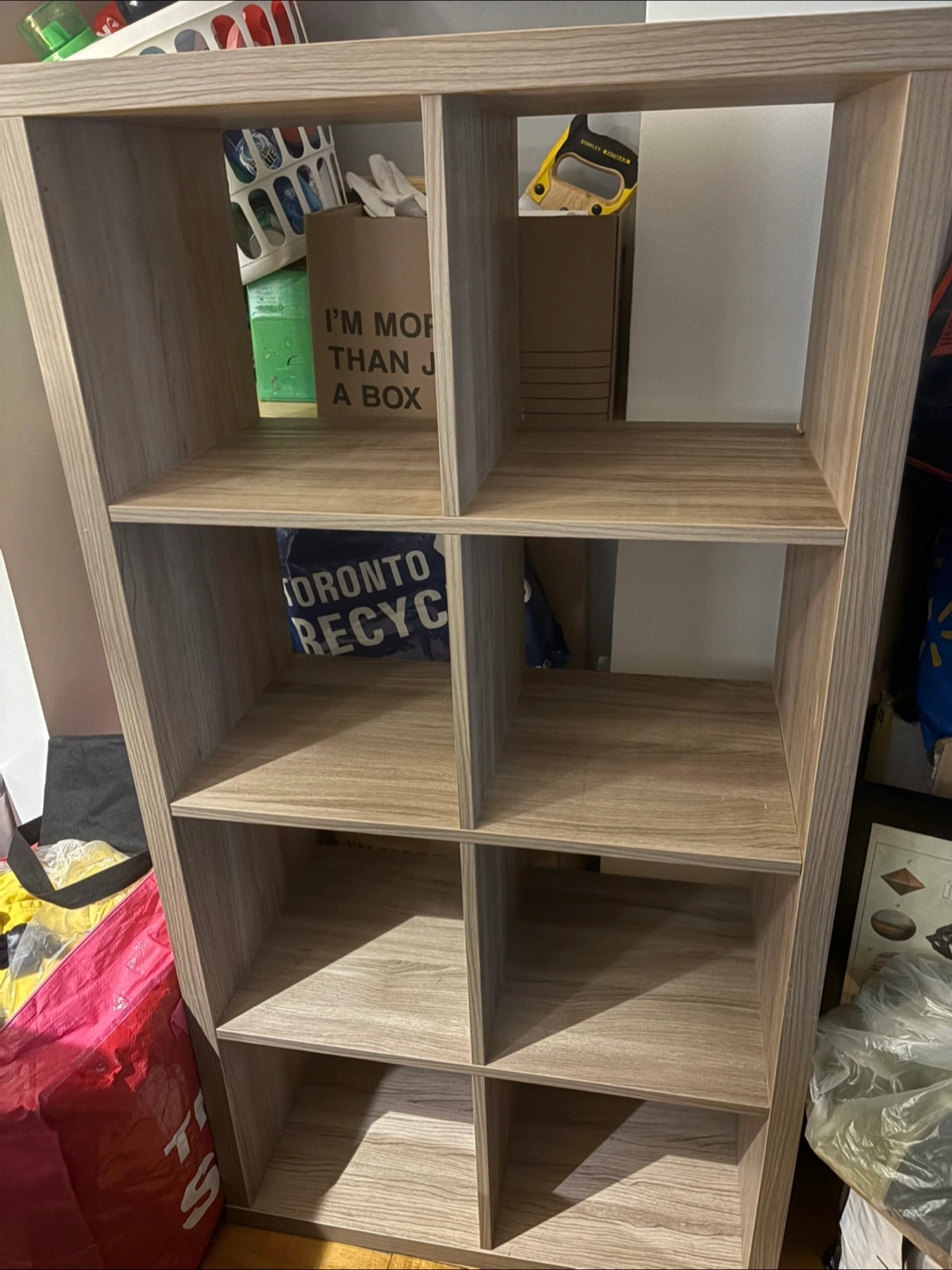 Selling a wooden shelf unit, perfect for organizing your space. It has a light brown, wood-grain finish. Could be great for books, decor, or storage bins! It's in good condition and ready for a new home. There are holes on either side of the shelf because shelf legs were added. Can include with purchase.