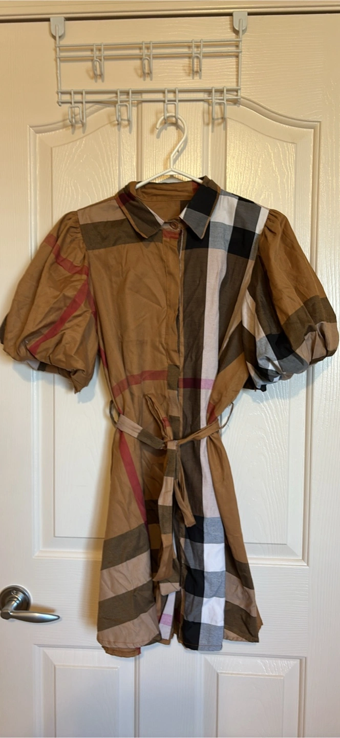 Cute plaid dress with a tie waist! It's in great condition and ready for a new home. The dress features a classic Burberry-inspired pattern with short puff sleeves.