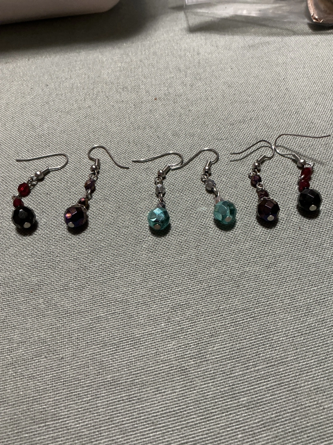 Selling a set of three pairs of handmade beaded earrings. Each pair features a unique colour combination and design. Great for adding a pop of colour to any outfit! All 3 pairs for one price.