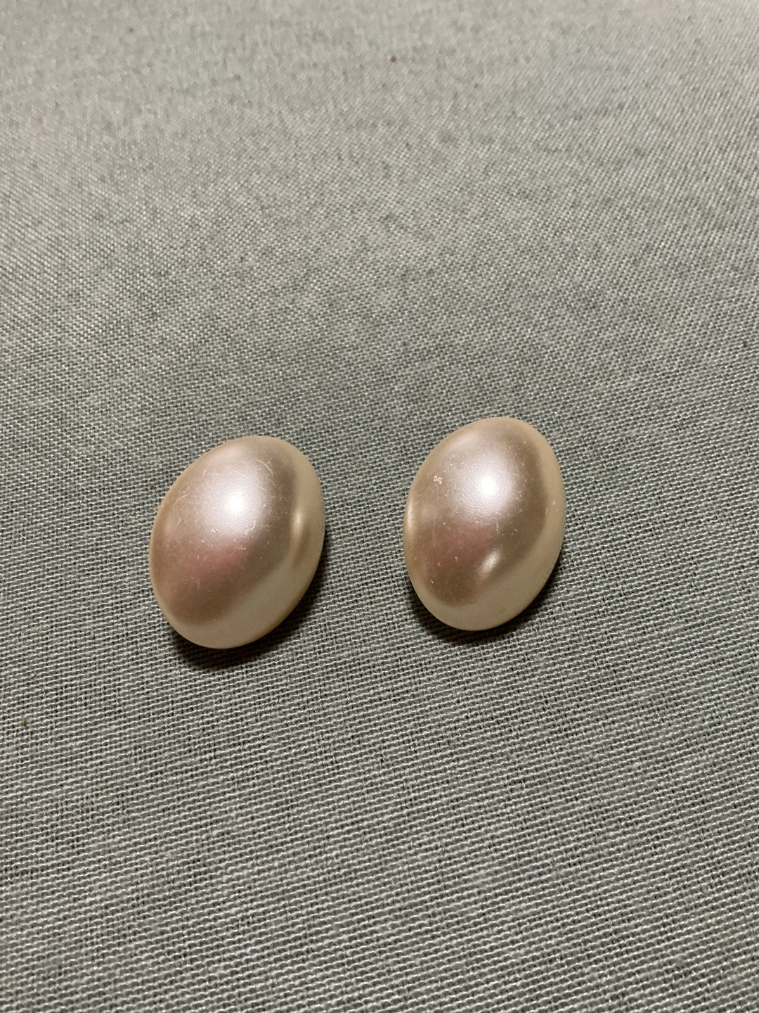 I'm selling these pearl-like earrings. They are a soft pink colour and have a clip on the back. They would be perfect for a special occasion or to add a touch of elegance to your everyday look
