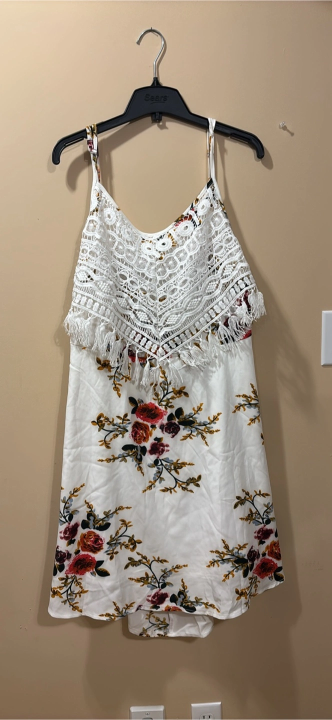 Super cute sundress with a floral print and crochet detailing! It's perfect for summer days and evenings out. The light and airy fabric makes it super comfortable to wear. It's in great condition and ready for a new home!