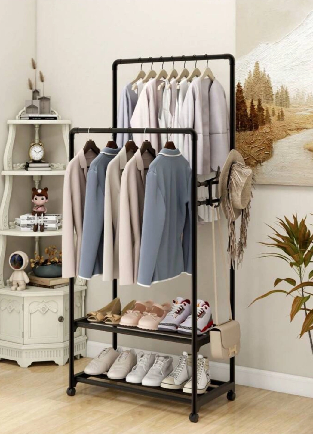 This is a handy rolling garment storage shelf rack, perfect for organizing your clothes and shoes! It's made of black metal and has two tiers for hanging clothes and two shelves for shoes or accessories