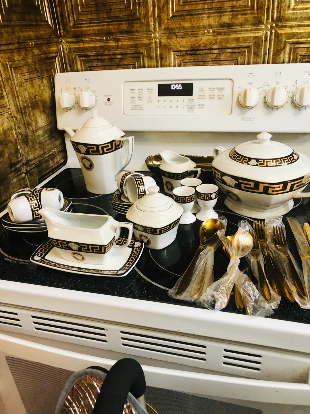 Gorgeous Versace Rosenthal Medusa tea set with gold accents! This set includes a teapot, cups, saucers, and cutlery. Perfect for adding a touch of luxury to your tea time