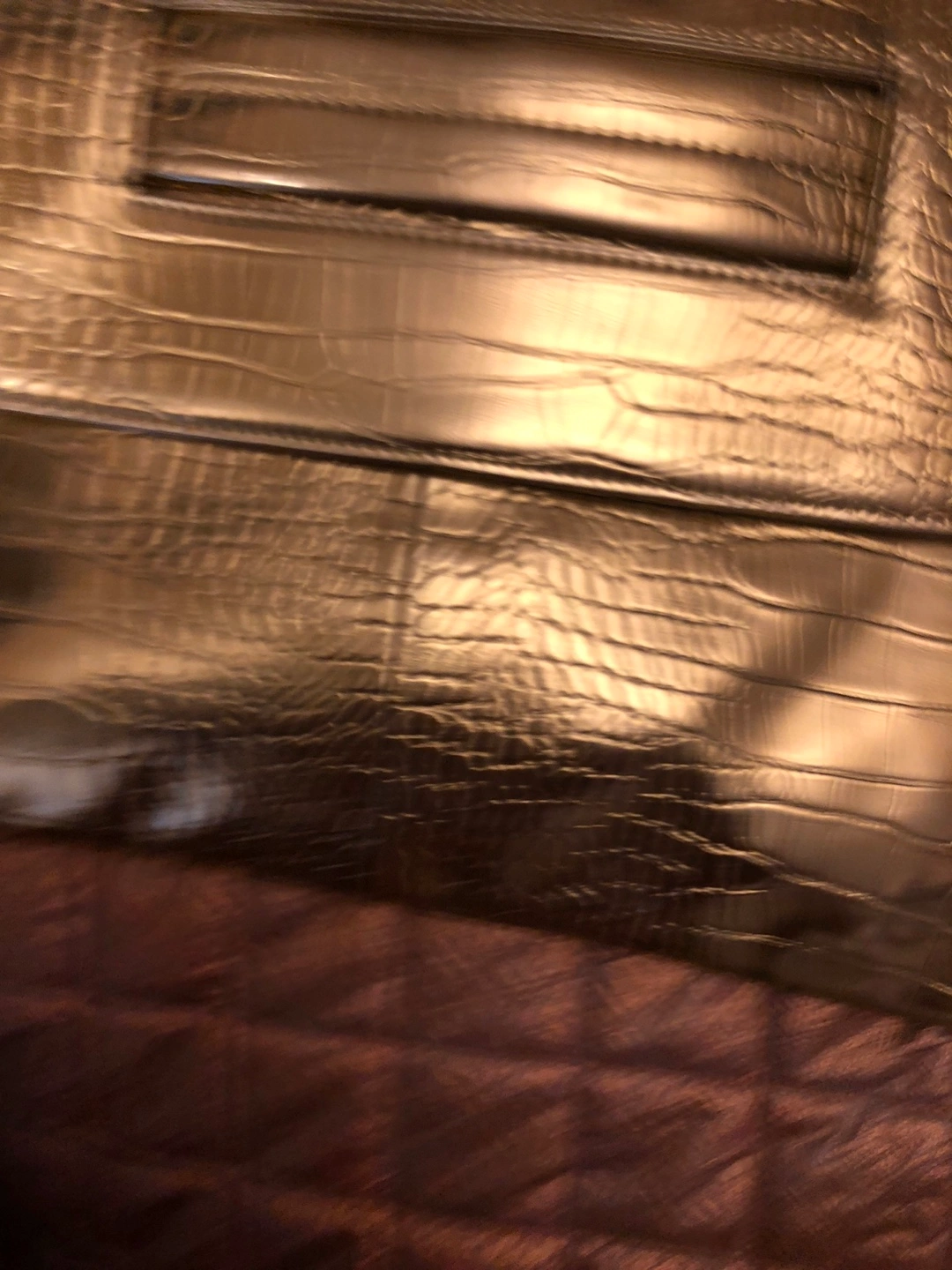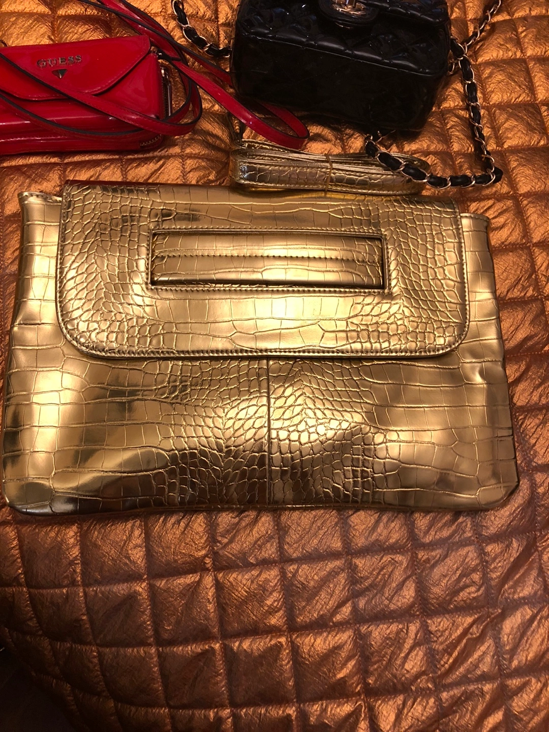 9Selling a lovely gold clutch with a crocodile skin texture. It's in great condition and perfect for a night out or special occasion! The colour is a beautiful metallic gold.