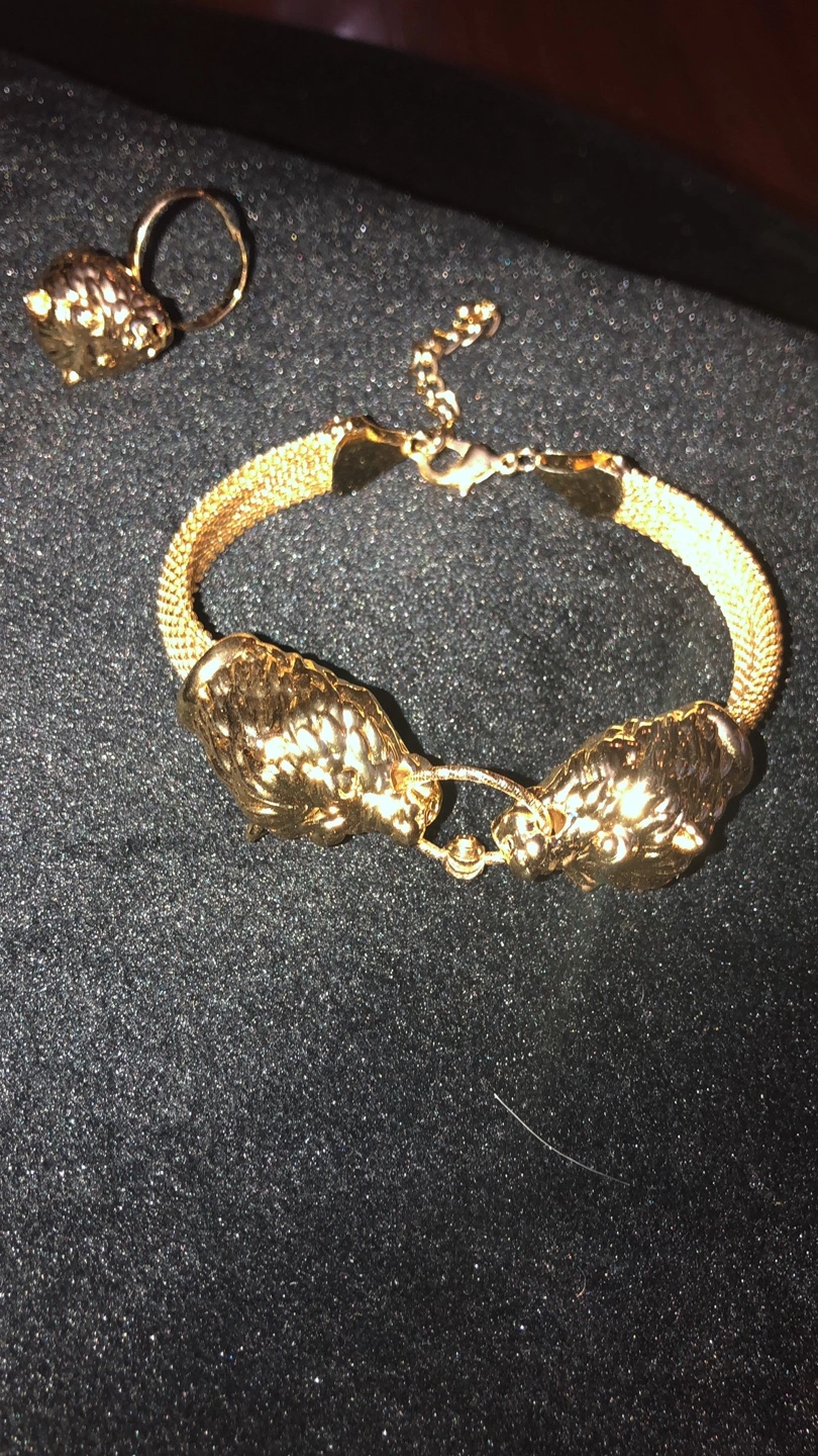 9Selling a cool gold-tone lion head bracelet and ring set! The bracelet has a unique mesh-like band. Both pieces have a bold, eye-catching design. Perfect for adding a touch of fierceness to your look