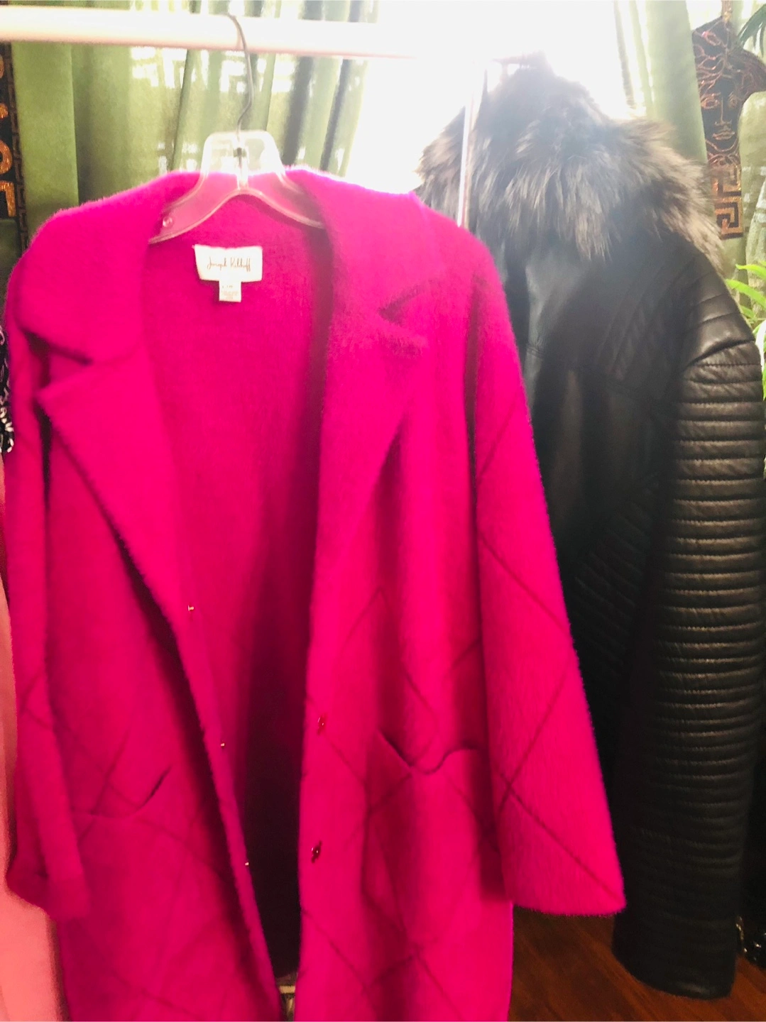 Here's a lovely Joseph Ribkoff coat in a vibrant pink! It's a size L/G. The material has a soft, fuzzy texture and the coat features a stylish design. Perfect for adding a pop of colour to your wardrobe!