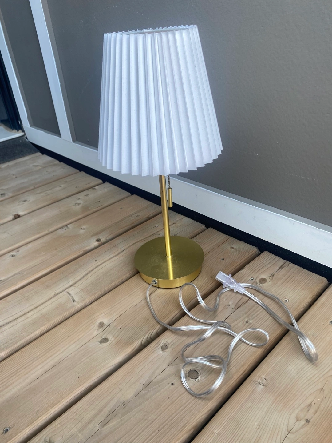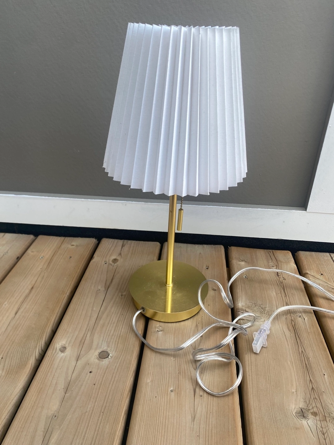 82Selling a cute table lamp with a white pleated shade and a gold-coloured base. It's in great condition and would look lovely on a bedside table or desk. The simple design makes it a versatile addition to any room!