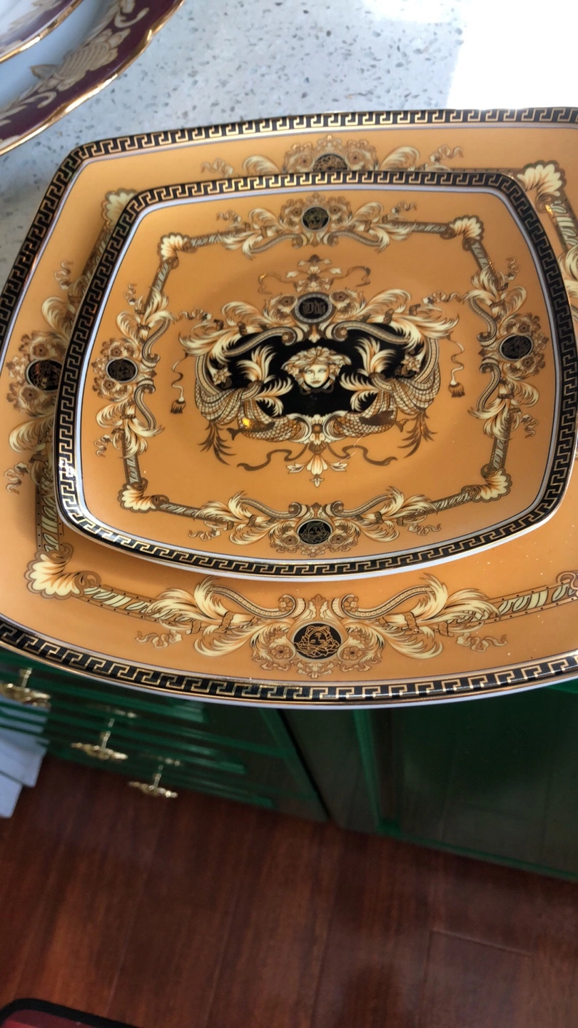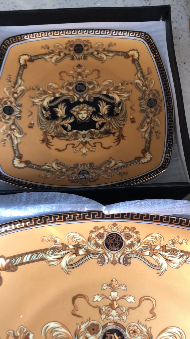 9Selling a set of Versace Medusa Gala square plates. These plates feature the iconic Medusa design and a beautiful gold and black pattern. Comes with the original box, perfect for gifting or adding a touch of luxury to your dining experience