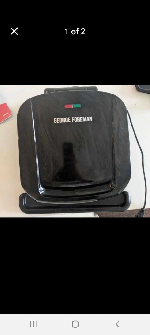 Selling a George Foreman grill, perfect for quick and healthy meals. This grill is in good, used condition and ready to use. It heats up quickly and is easy to clean. Brand: George Foreman, Type: Electric Grill, Colour: Black, Non-stick coating for easy cleaning. Asking $20. This ad is live, so yes, it's still available!