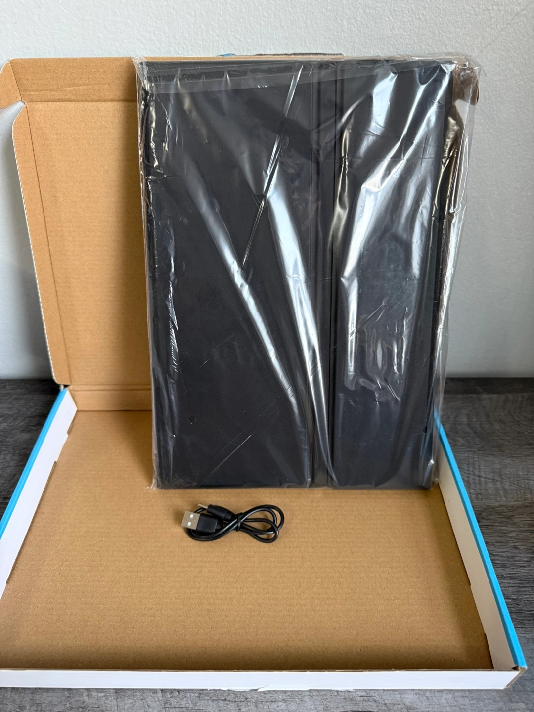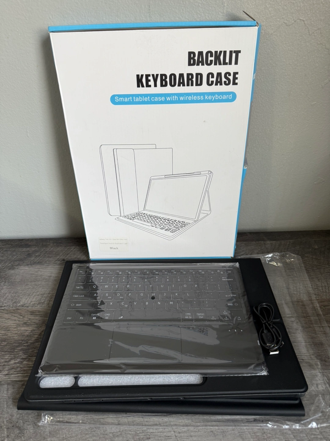 73Selling a brand new backlit keyboard case for Samsung Galaxy Tab S8 Ultra, S9 Ultra, and S10 Ultra. It's a smart tablet case with a wireless keyboard. The case is black and includes the necessary charging cable. Perfect for anyone looking to enhance their tablet experience!