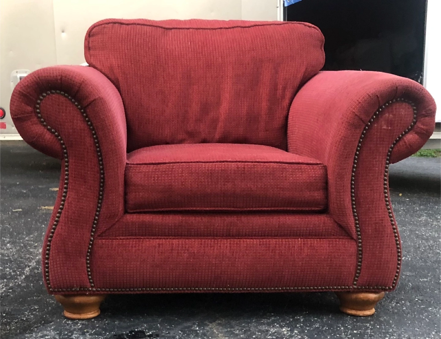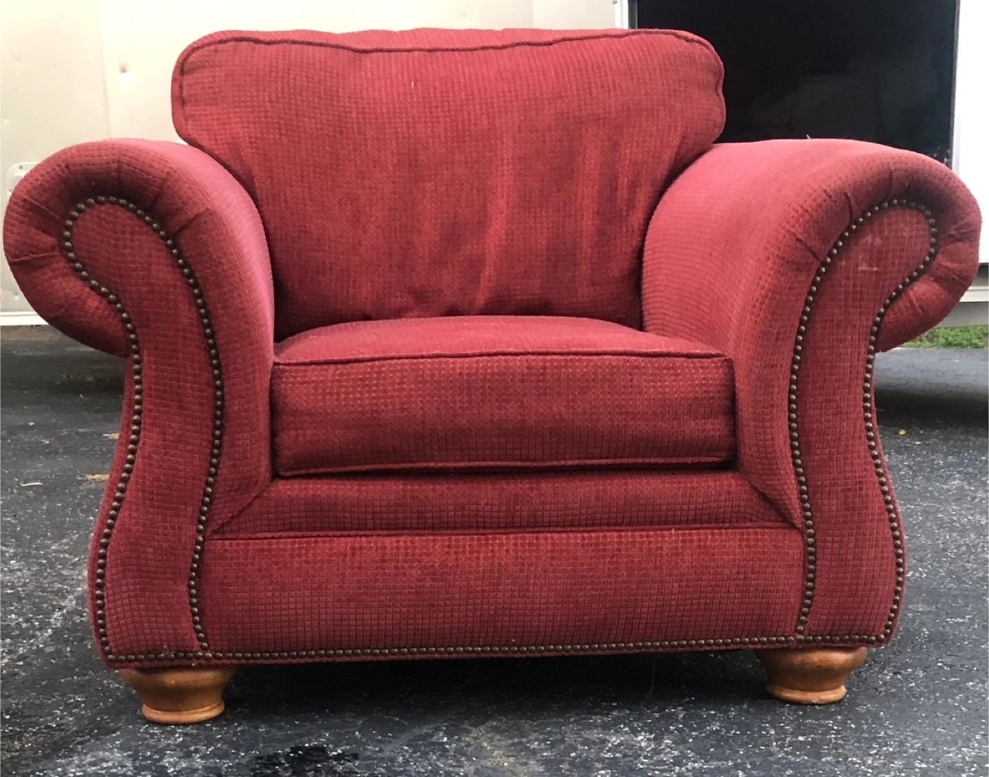 Here's a comfy upholstered armchair in a lovely red color! It would look great in any living room or den. The chair has a classic design with nailhead trim and wooden feet.