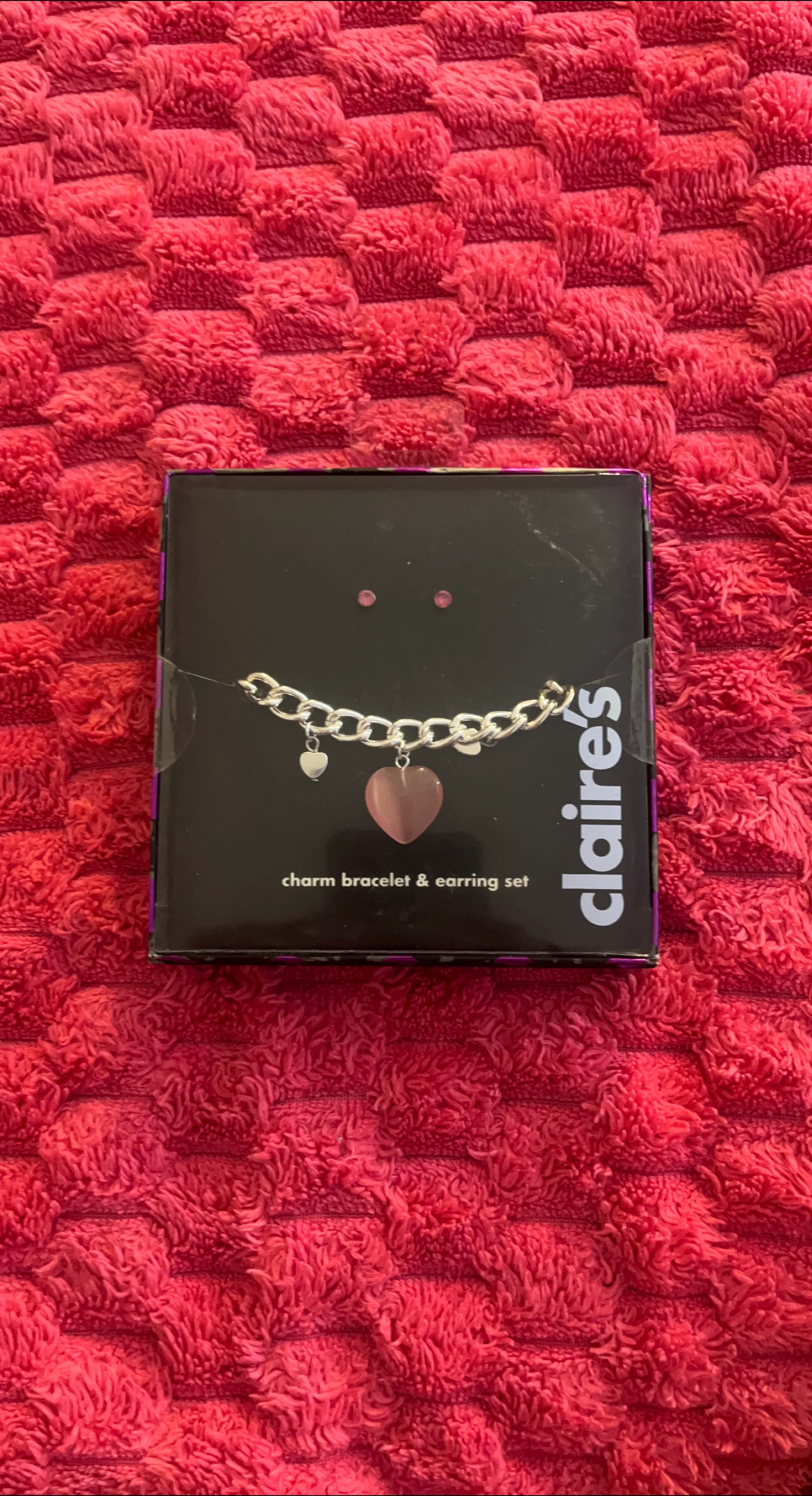 Selling a Claire's charm bracelet and earring set! It comes in the original box and is brand new never been worn. The set features a silver-tone chain bracelet with heart charms and matching stud earrings