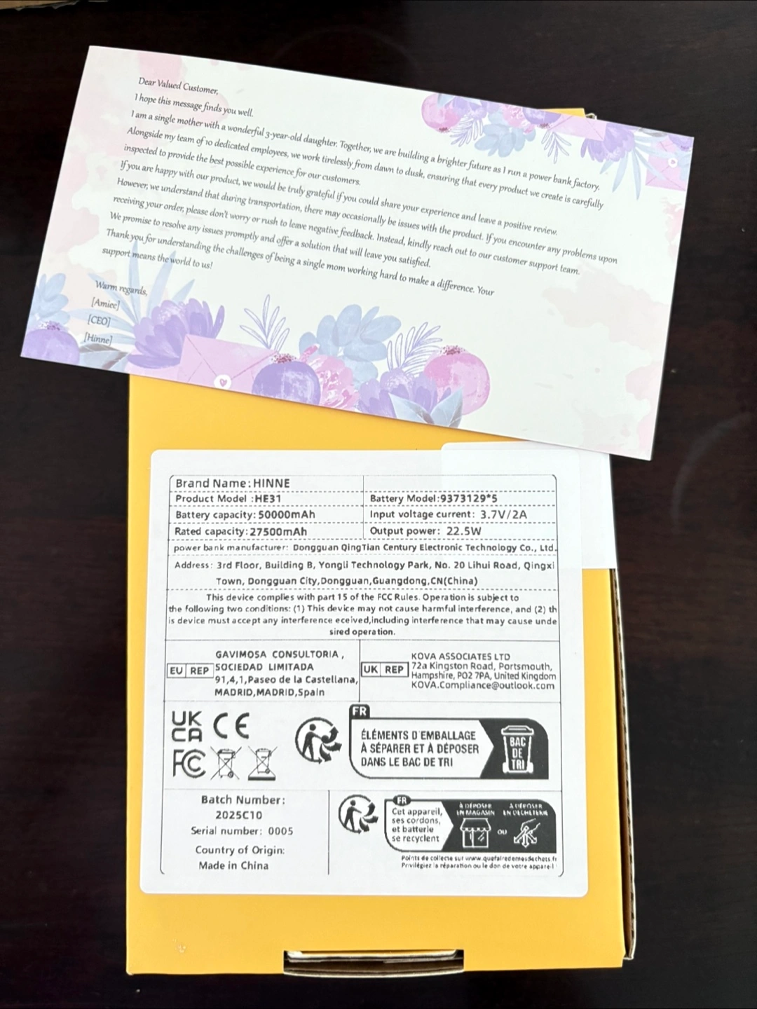 68Selling a brand new Hinne HE31 Power Bank! It's still in its original packaging. Here are some details: - Brand: Hinne - Model: HE31 - Battery capacity: 50000mAh - Rated capacity: 27500mAh - Output power: 22.5W - Input voltage current: 3.7V/2A Nepean
