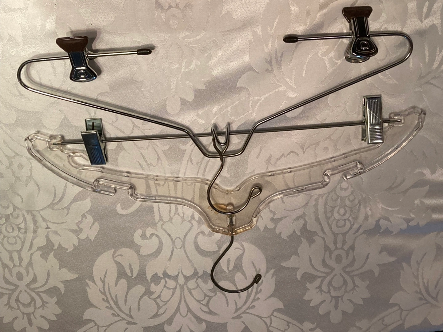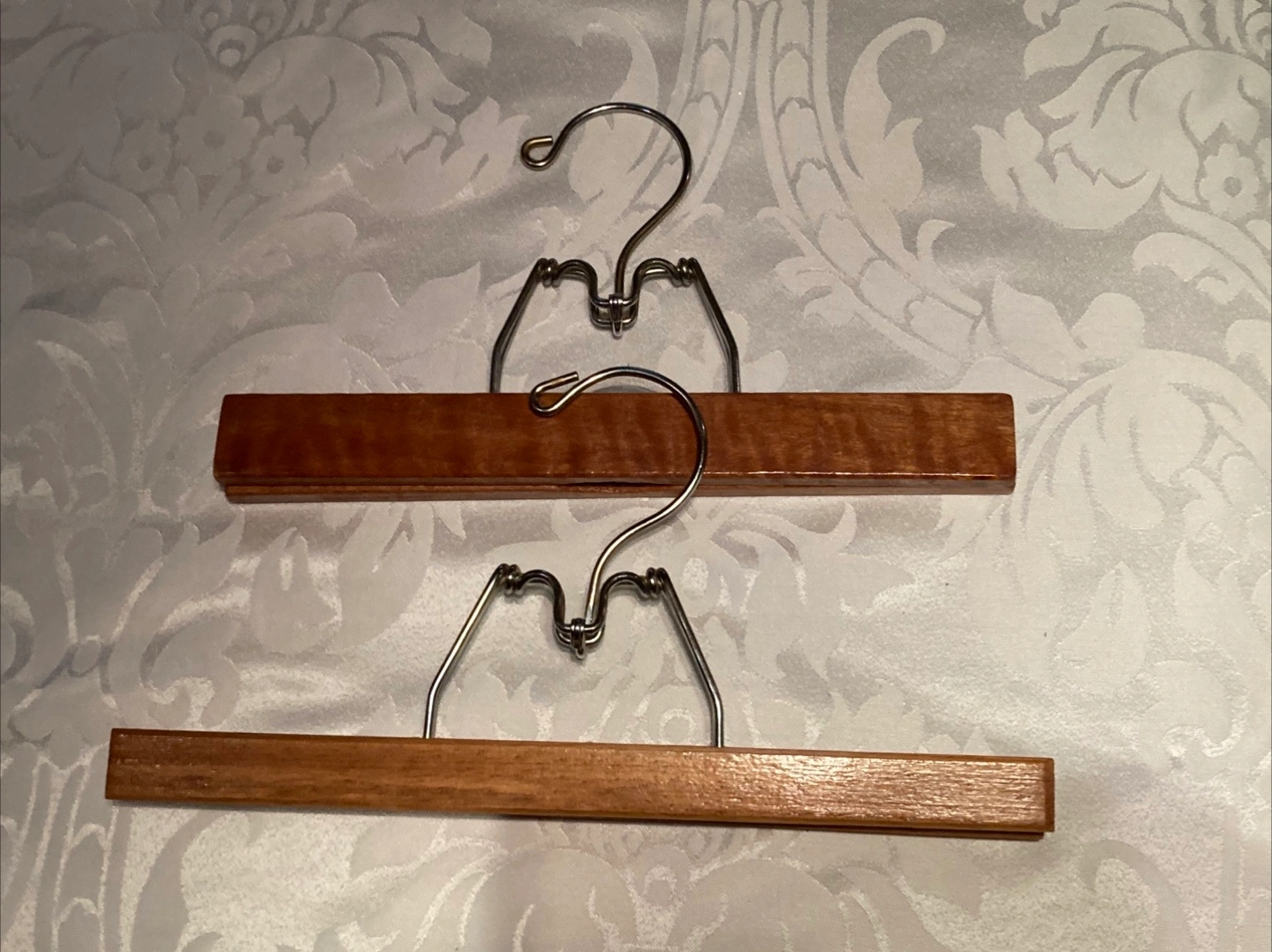 Selling a variety of wooden and clear plastic clothes hangers. Great for pants and skirts! 6 dark brown wood and 2 light brown wood hangers and 2 plastic/metal hangers.