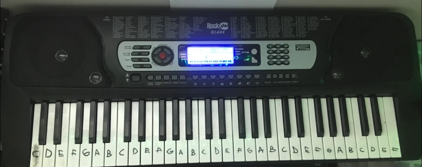 Selling a RockJam RJ-654 keyboard. It has 100 tones and rhythms to choose from. Also, the keys have been marked with letters.