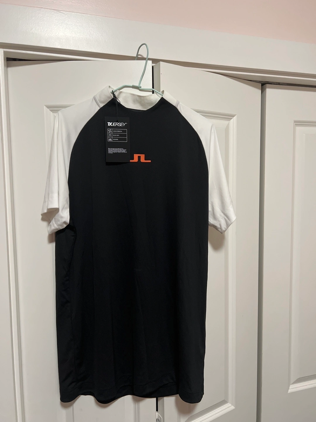 This is a J.Lindeberg TX Jersey in black and white. It's made with 2-way stretch fabric and is quick drying. Perfect for sports or casual wear!