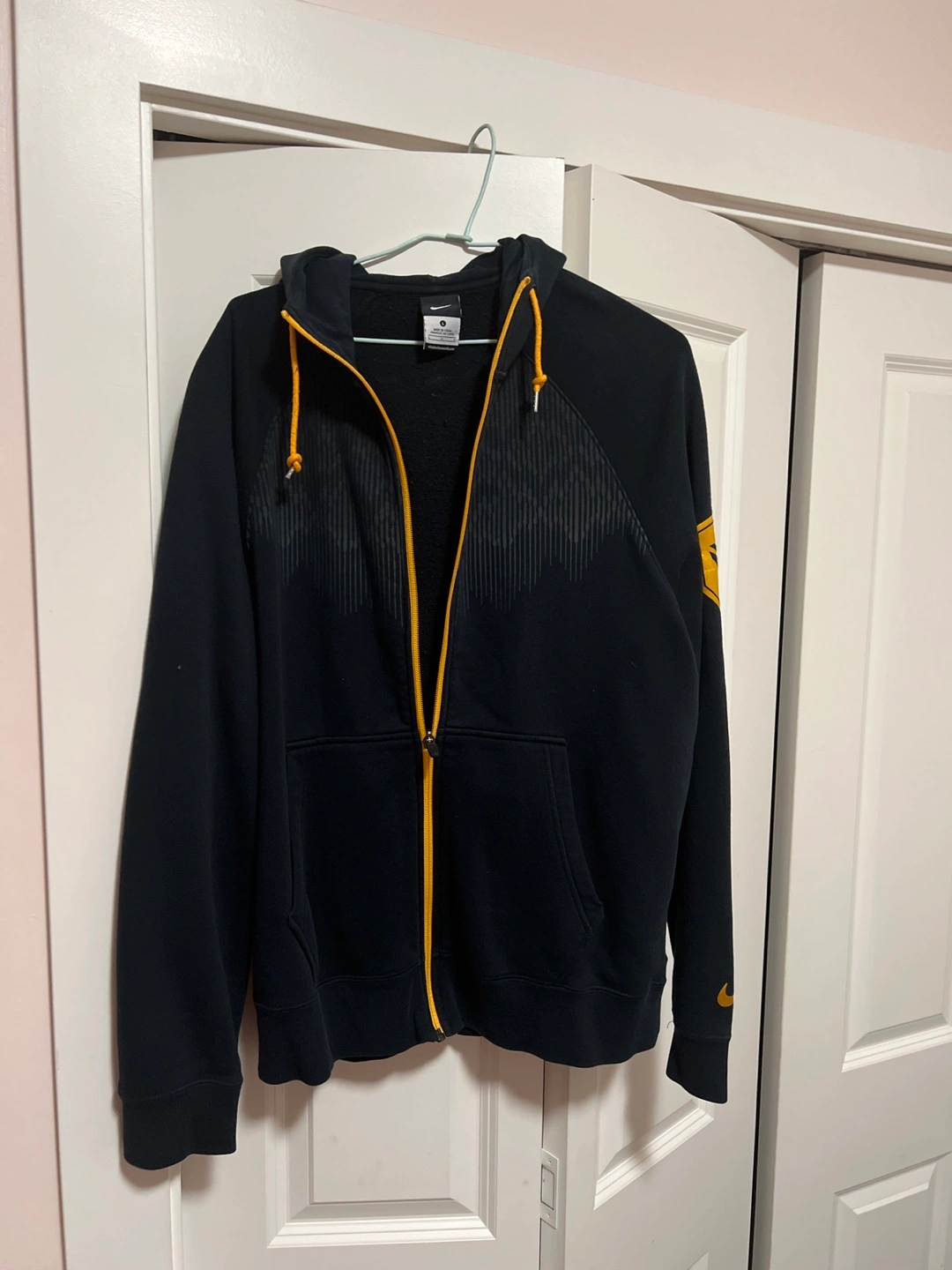 Selling a Nike full zip hoodie in black with gold accents! It's in great condition and features a full zipper, a hood, and the Nike logo on the sleeve. Perfect for layering or wearing on its own!