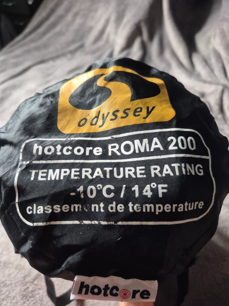 82Selling a Hotcore ROMA 200 lightweight sleeping bag in good condition. It's rated for -10°C / 14°F. The size is 66" x 32" / 22". The shell is made of polyester diamond ripstop/polyester, with a polyester lining and 200G/SM Trueloft fiber + 100G/SM filling. It weighs 2.5 lbs / 1.13 kg. Ideal for overnight backcountry hiking or just regular use. Can be unzipped and also be used as a blanket. Top can be tied to mummy style.