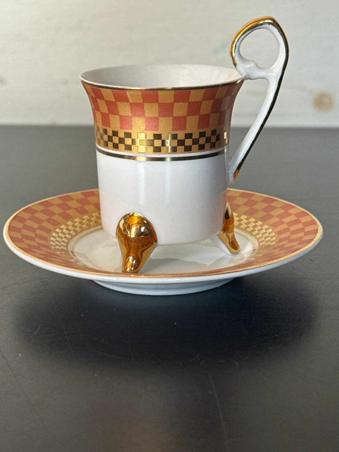 Selling a decorative cup and saucer set. It features a unique design with gold accents and a checkered pattern. Set of 6