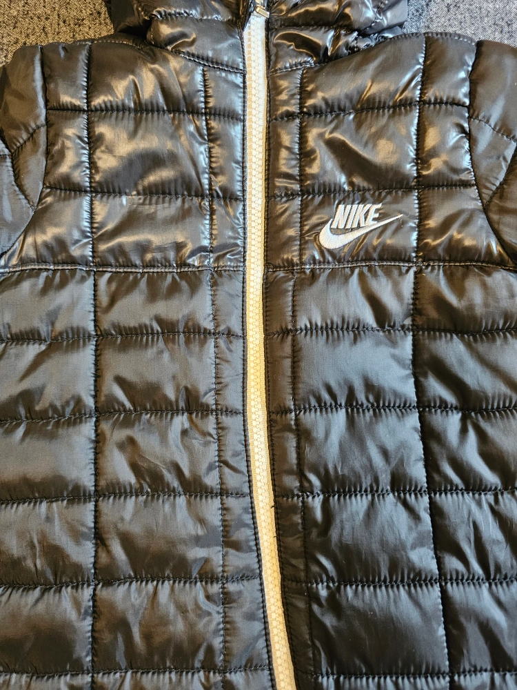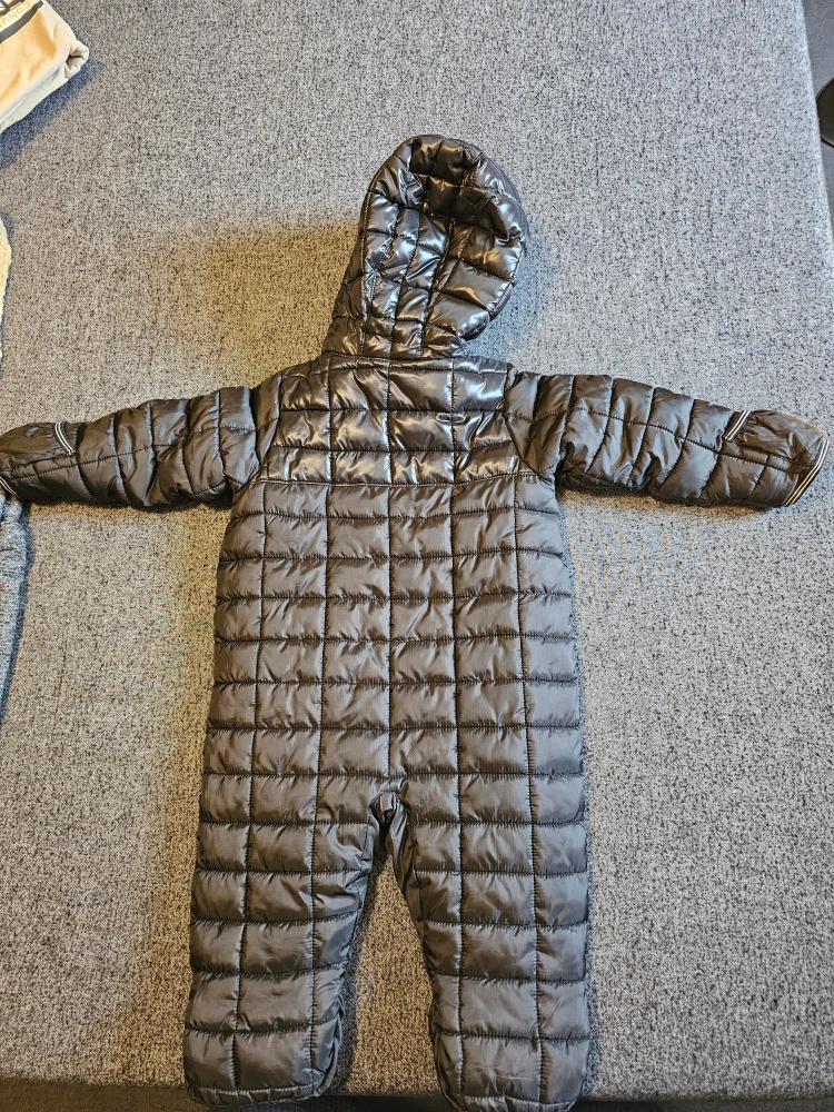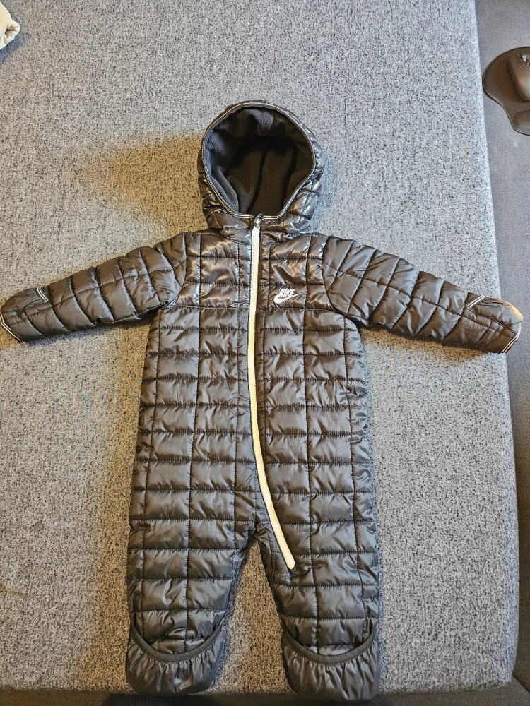 150Keep your little one warm this winter with this Nike puffer snowsuit! It's in great condition and perfect for babies around 12 months old (74-80cm). The quilted design and cozy hood will keep them snug and stylish.