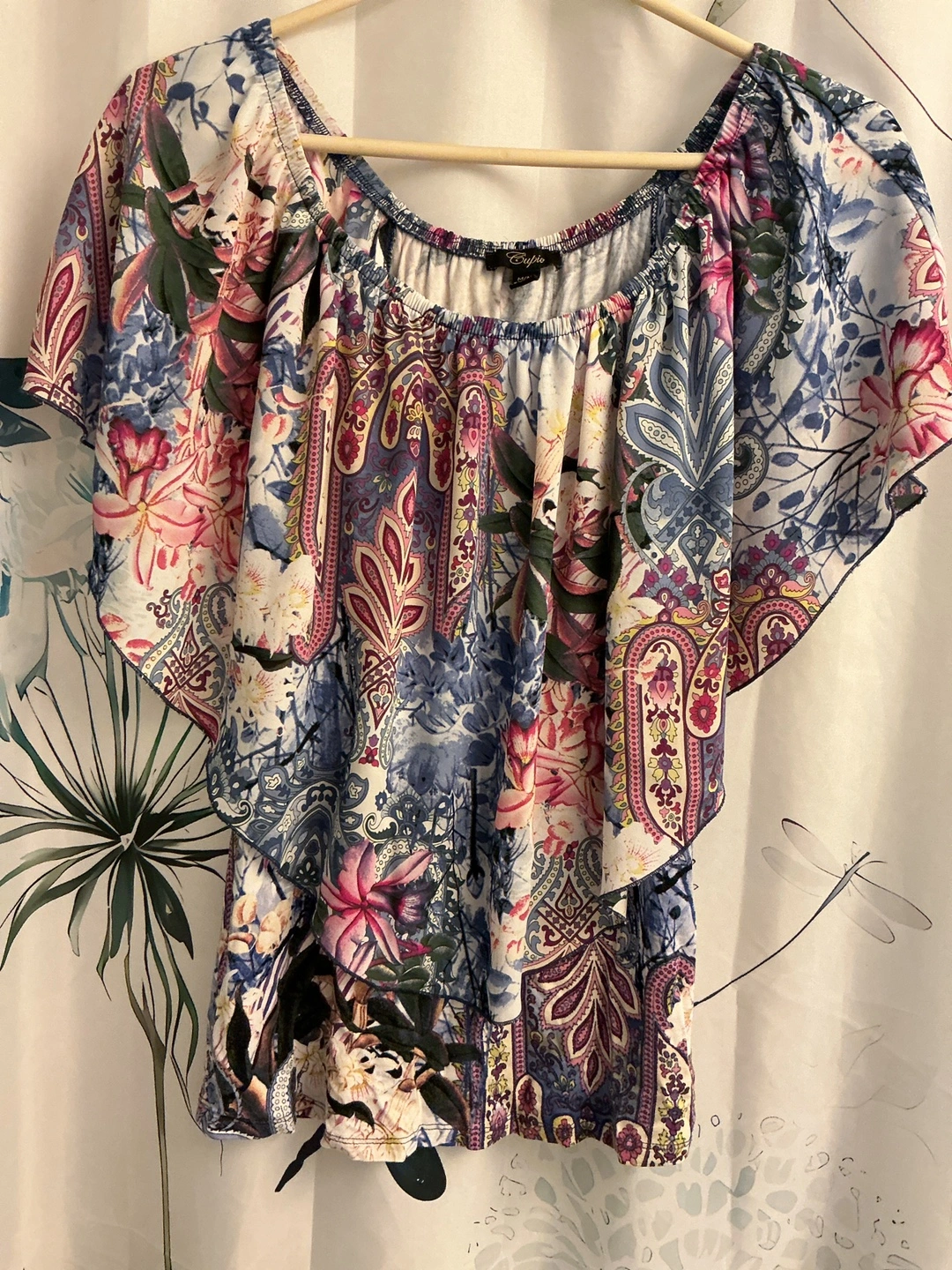 This is a colourful floral print off-shoulder blouse. Flounce covers both front and back. Great for camouflage the stomach. lol. It's perfect for adding a pop of colour to your wardrobe. It's in great condition and ready for a new home