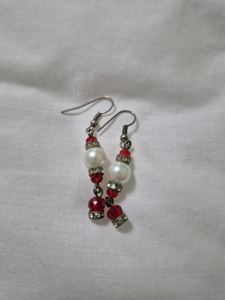18These are a pair of elegant dangle earrings. They feature faux pearls, red crystals, and silver-tone metal. Perfect for adding a touch of sparkle to any outfit!