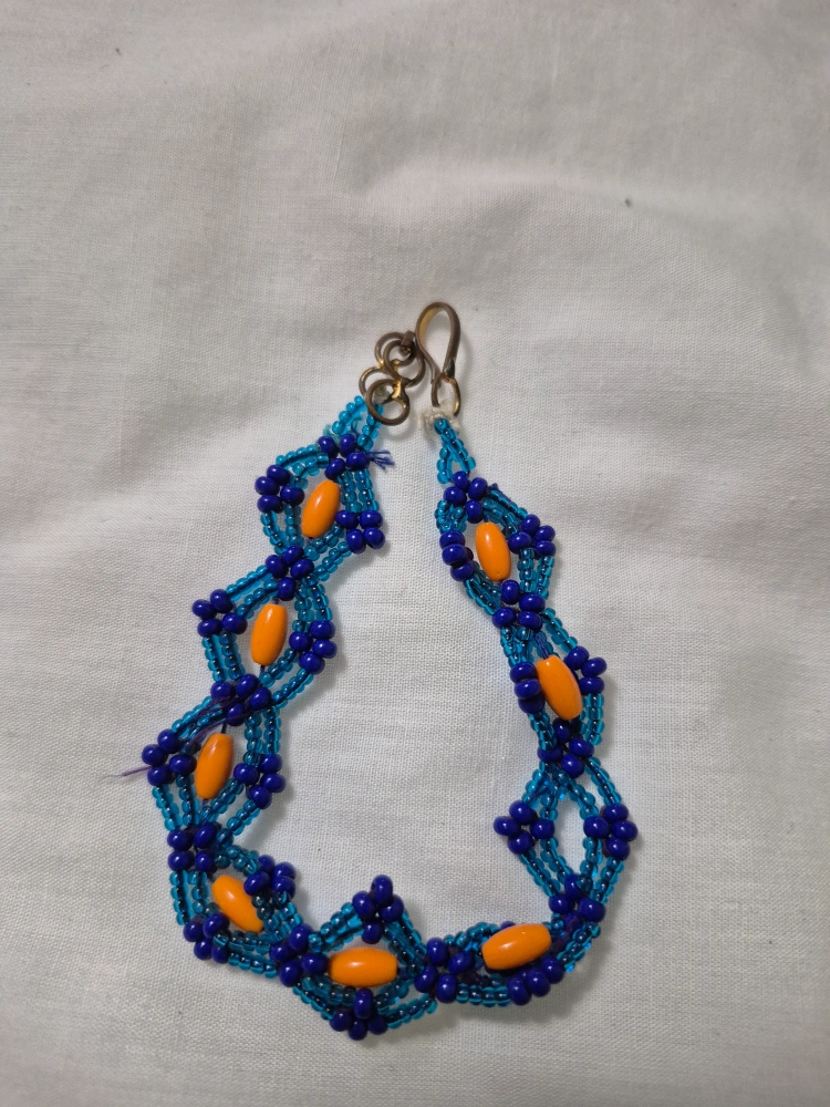 18Selling a unique handmade beaded bracelet. It features a beautiful combination of blue and orange beads, creating a vibrant and eye-catching design. It's perfect for adding a pop of colour to any outfit!