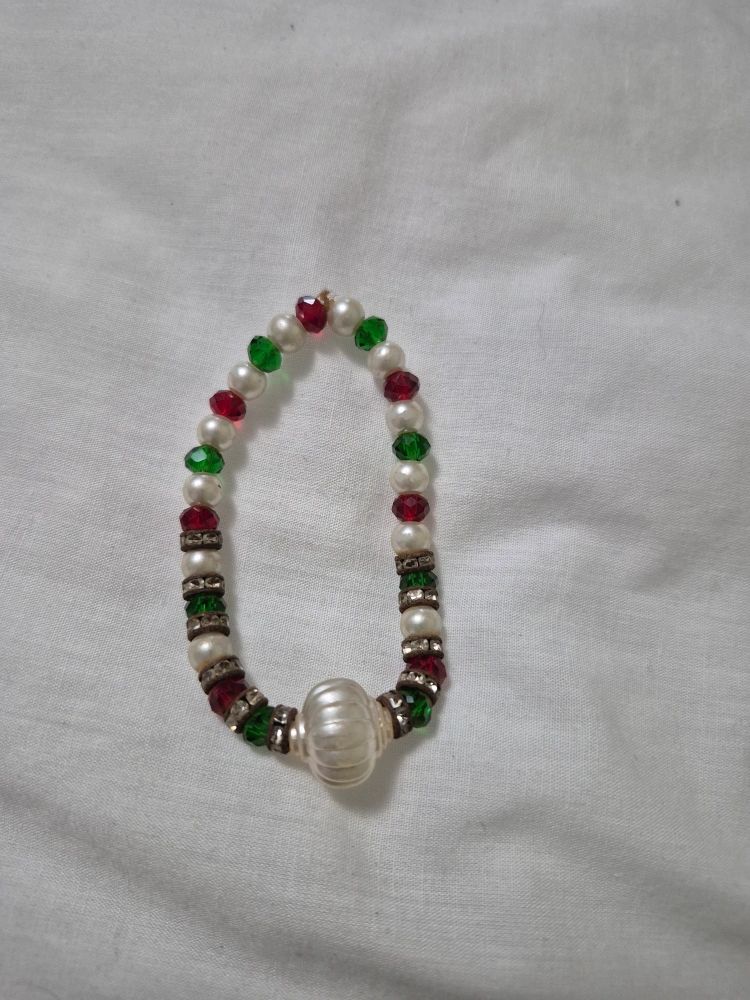 18Selling a pretty beaded bracelet featuring red, green, and pearl-coloured beads. It would look great for the holidays!